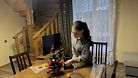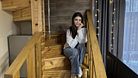 жилая комната с двуспальной кроватью, кухонная зона, диван, санузел, мансардные окна с видом на лес.
