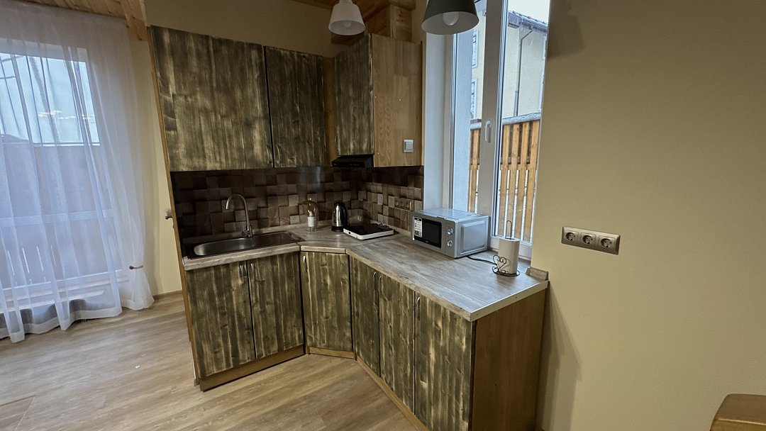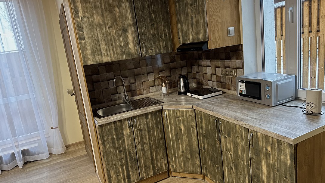 - уютная комната отдыха с двумя двуспальными кроватями с полноценным кухонным гарнитуром