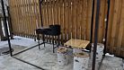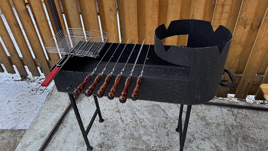 Мангал с крышей, шампуры, решётка, уличная мебель, пледы, летний кран и раковина.