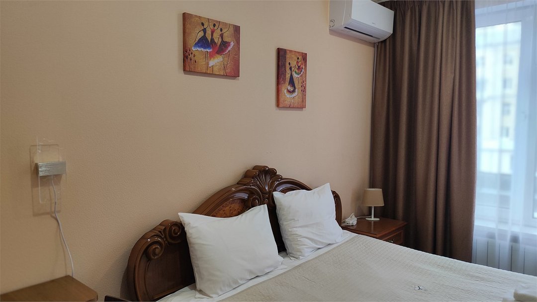Wi-Fi, холодильник, настольные лампы, фен, вентилятор, микроволновая печь, обогреватель, банные полотенца, гигиенические средства, двуспальная кровать, гладильная доска, стулья, шкаф для одежды, вешалки, зеркало, набор посуды, чайник, унитаз, раковина, отопление, душ, кулер на этаже, стаканы, столовые приборы, стол, тумба, туалетные средства, сплит-система, телевизор с плоским экраном, шкаф-купе, номер для некурящих, бутилированная вода, без питомцевВ номере