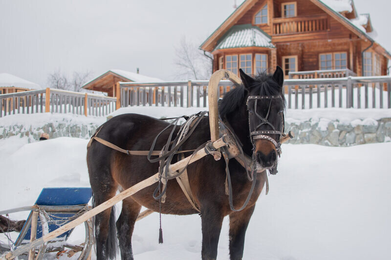 - в санях (1 санная упряжка на 4 гостя) — 4000 ₽/час;