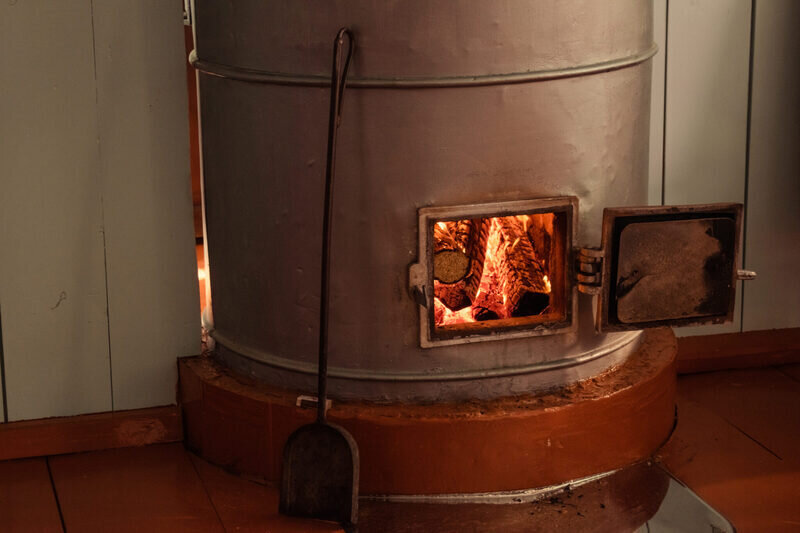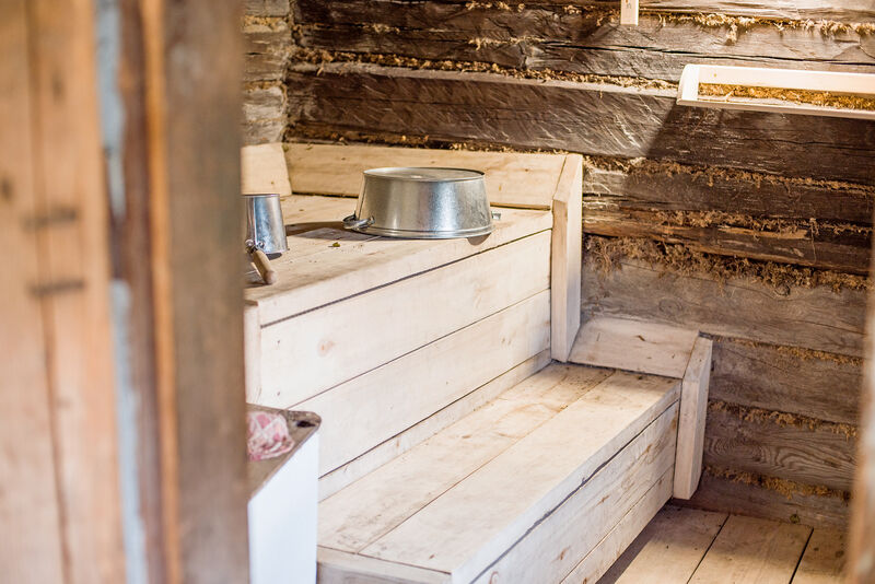Это баня, где печь не имеет трубы и раскалённый дым проходит через помещение парной, прогревая стены, и выходит через отверстие в стене и немного приоткрытую дверь, а парилка покрывается копотью.