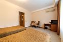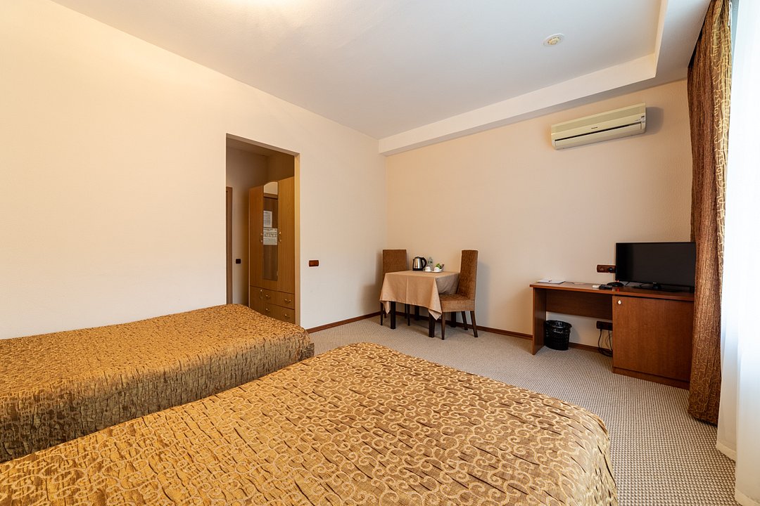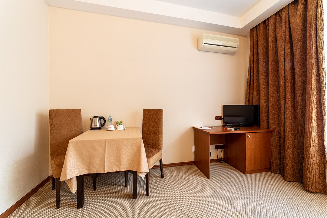Номер оснащен телевизором и минибаром (работают), есть кондиционер (не пользовались), одноразовые тапочки. В санузле тоже все исправно, есть мыло,гель,шампунь (в саше). Завтрак нужно выбрать и заказать заранее, в т.ч. время. Остались довольны и сыты. На столе в номере есть пара стаканов, в холле куллер с горячей/холодной водой. Ежедневно в номер на столе ставят бутылочку воды.
