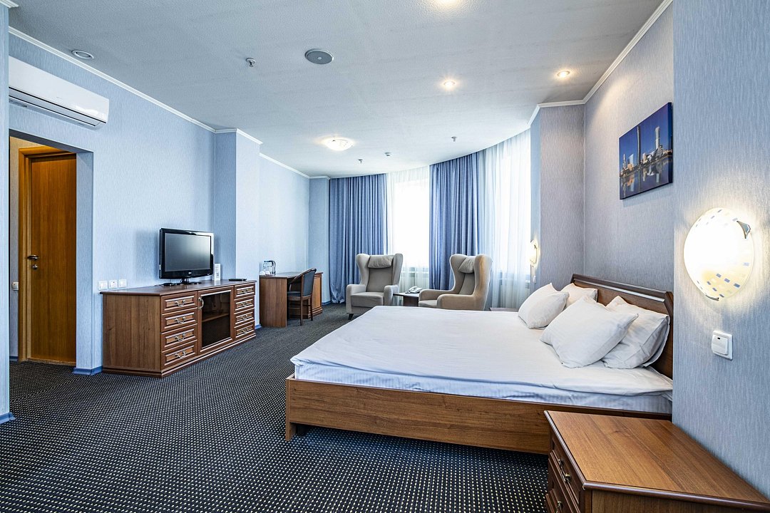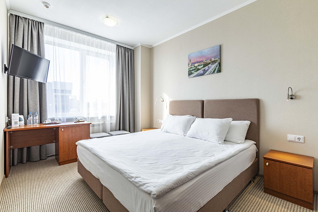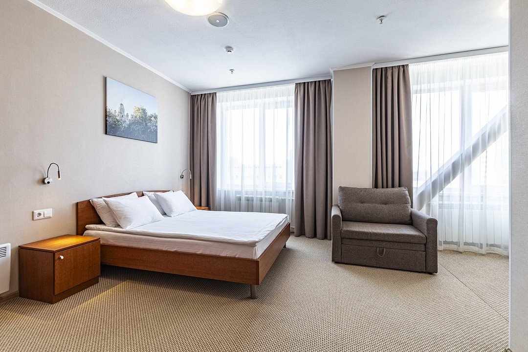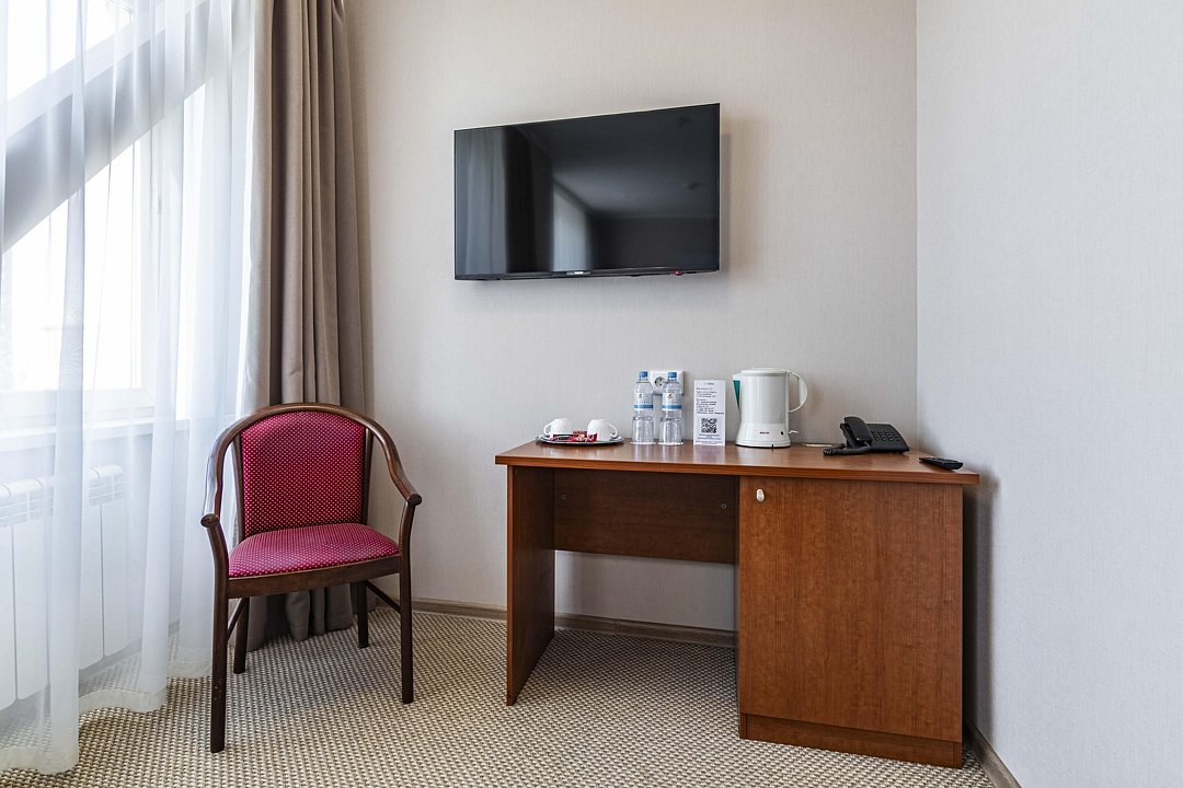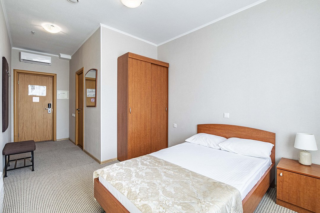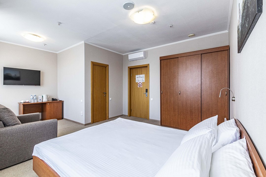В номере: двуспальная кровать, кресло-кровать, шкаф-купе, холодильник, чайник, рабочий стол, телефон, ТВ, бесплатный доступ в интернет (WI-FI).