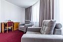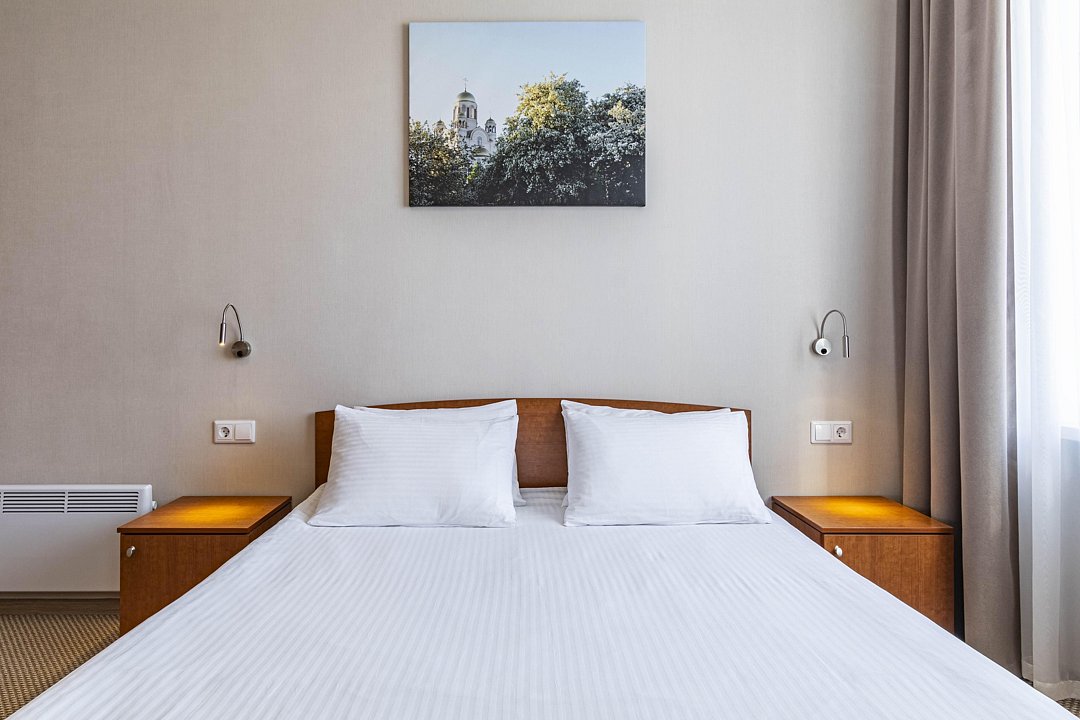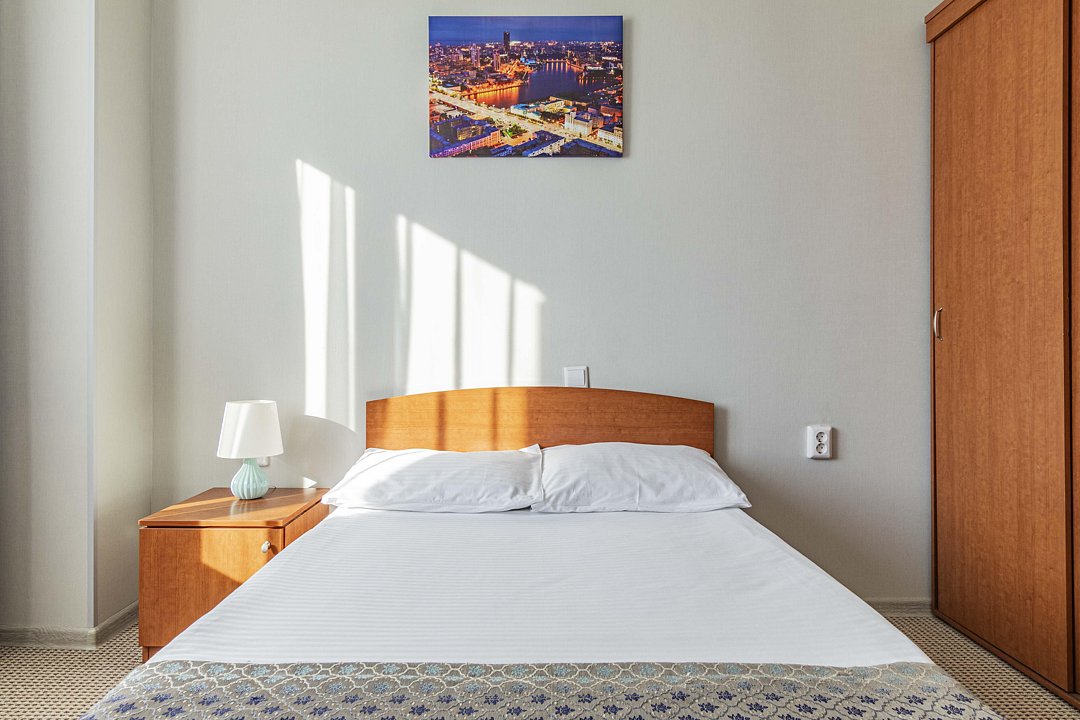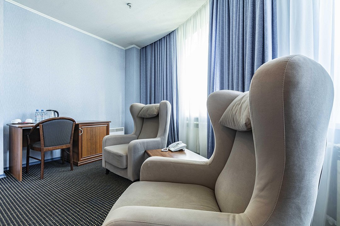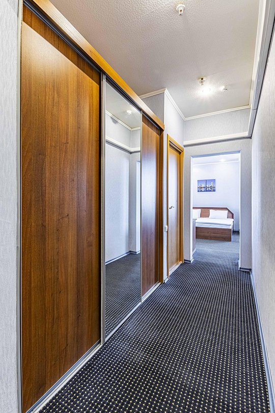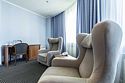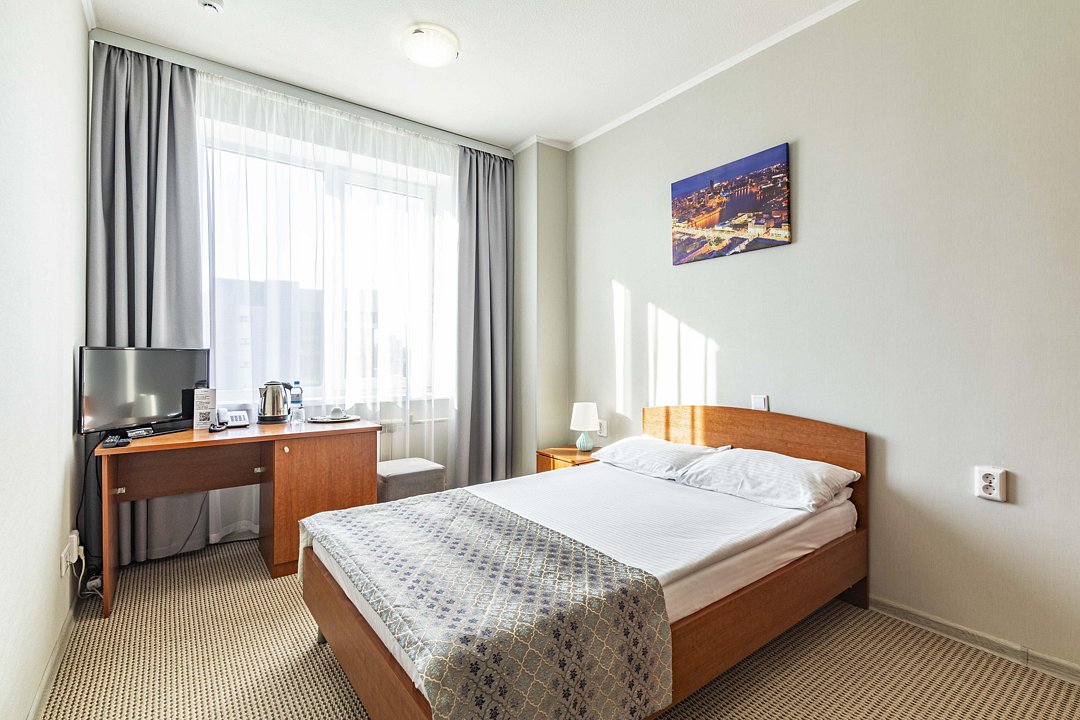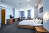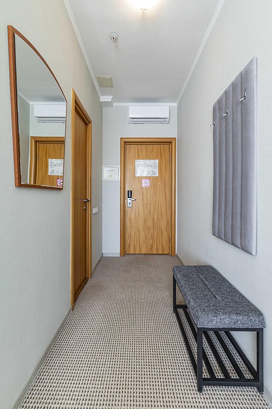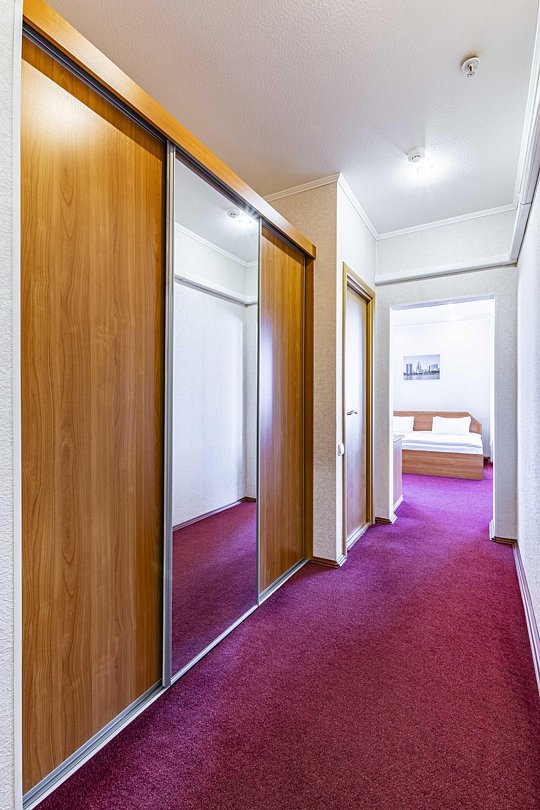 В номере: двуспальная кровать, кресло-кровать, шкаф-купе, холодильник, чайник, рабочий стол, телефон, ТВ, бесплатный доступ в интернет (WI-FI).