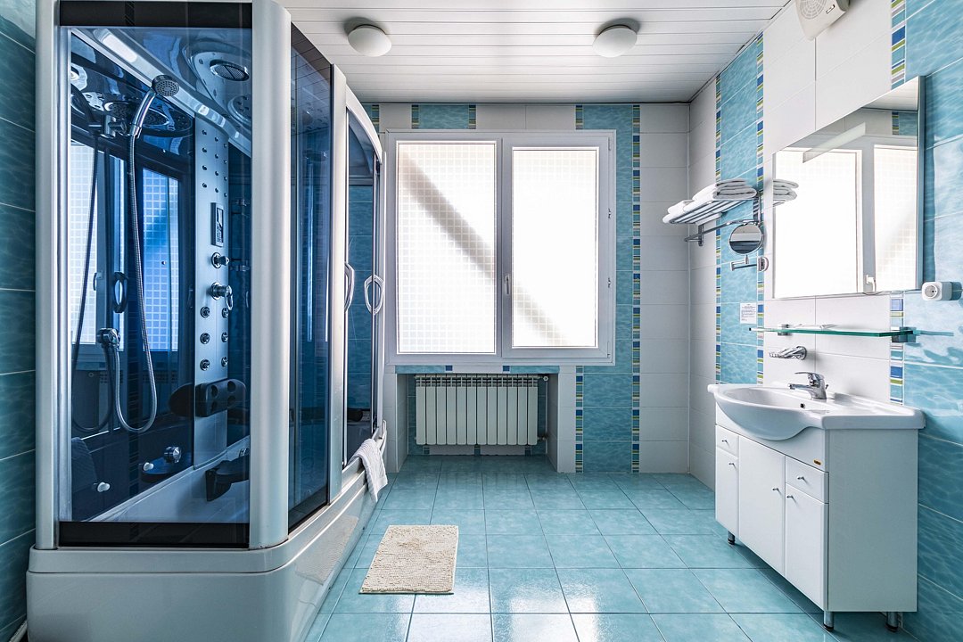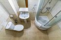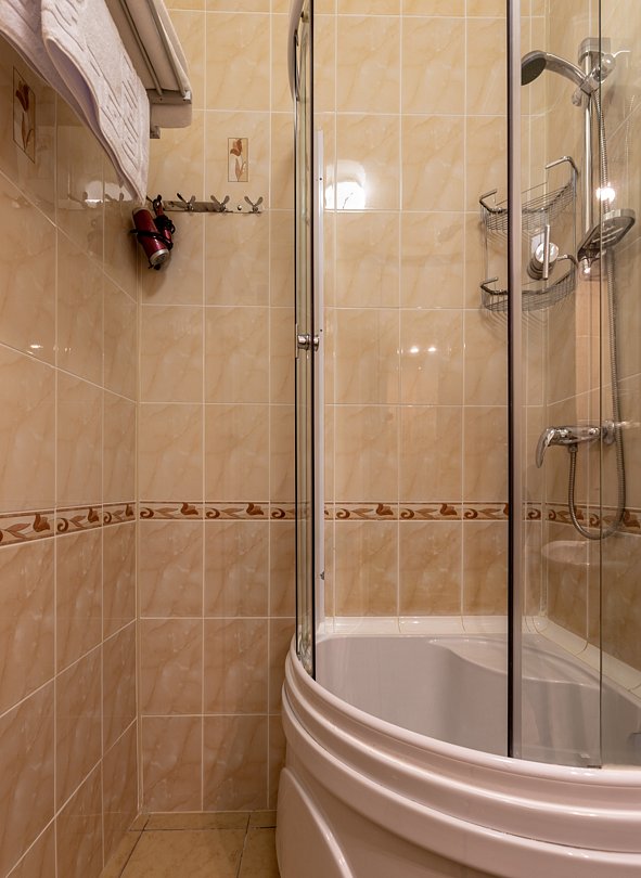 В ванной комнате: душевая кабина, фен, полотенца, мыло, шампунь, халат, тапочки.