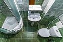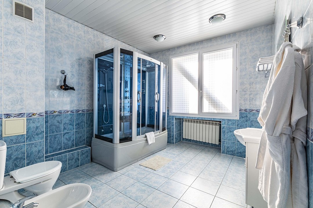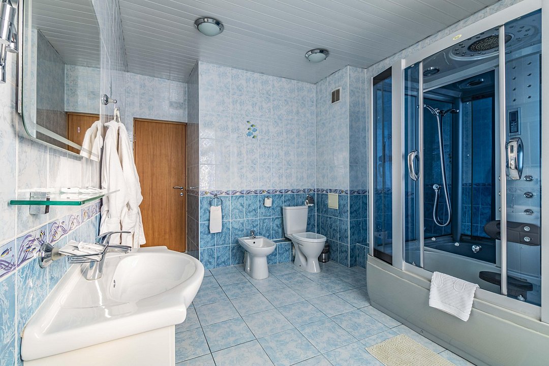 В ванной комнате: ванна-душевая кабина, биде, фен, халат, тапочки, мыло, шампунь.