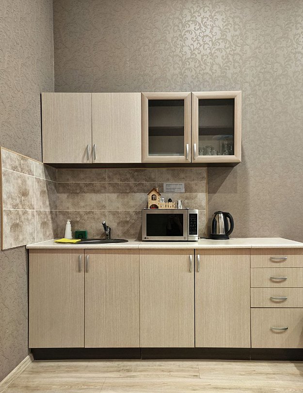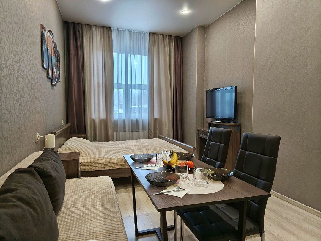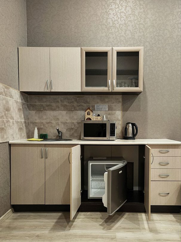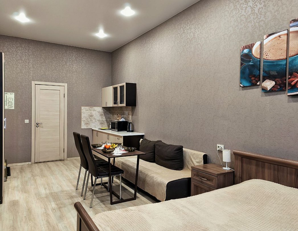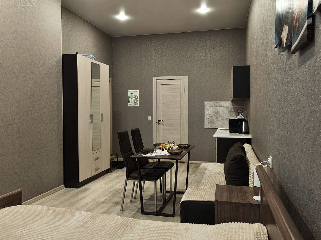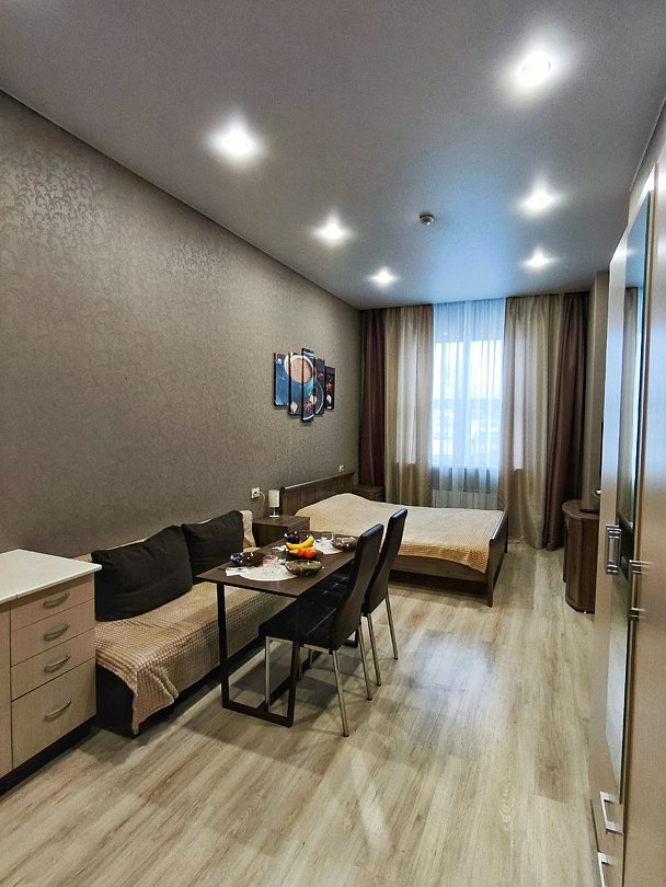 Номер повышенной комфортности Стандарт 102 – большой просторный номер со своим санузлом, интерактивным тв, холодильником, кухонной зоной, большой кроватью king-size, двухместным диваном и вместительным шкафом для хранения одежды.