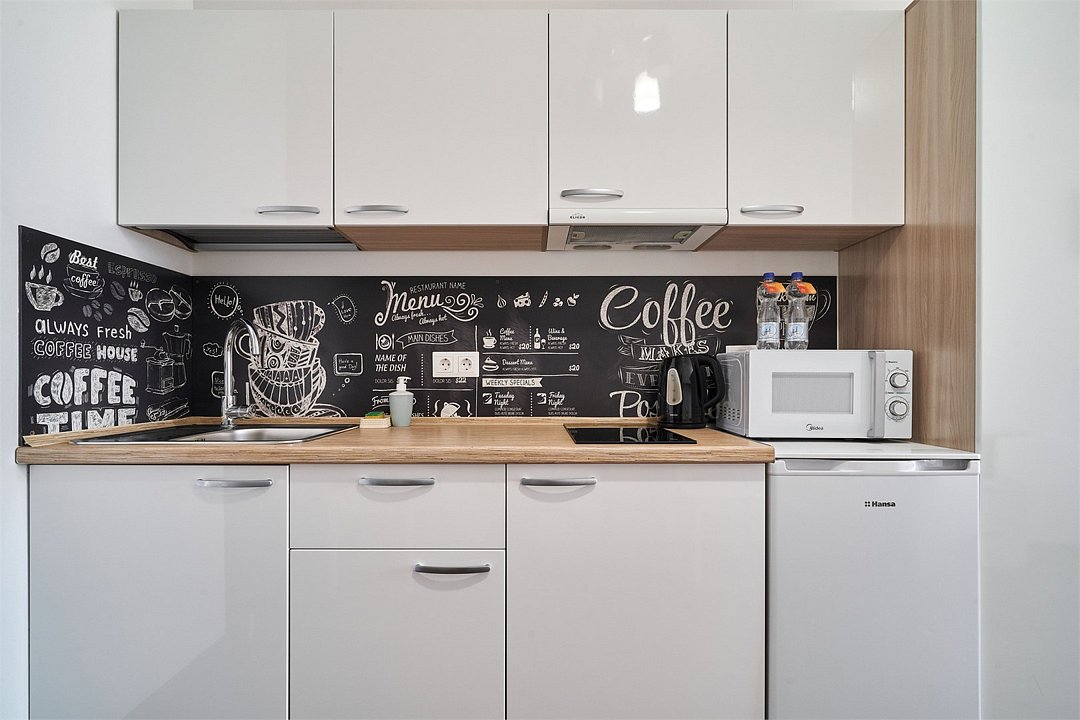Для комфортного проживания: диван-кровать с анатомическим матрасом (размер спального места 150-190 см), полноценная кухня с варочной поверхностью, вместительным холодильником, микроволновой печью, электрическим чайником и полным комплектом посуды для двух гостей, вместительные шкафы, телевизор, кондиционер, гладильная доска, утюг, стиральная машина (не во всех номерах данной категории). В ванной комнате: душевая кабина, фен, мини-парфюмерия, комплект полотенец, тапочки. Цифровое ТВ, интернет Wi-Fi. При заезде взимается обеспечительный платеж в размере 2 000 рублей, который возвращается по выезду в течение 5 банковских дней, при соблюдении правил проживания.Услуги и удобства
