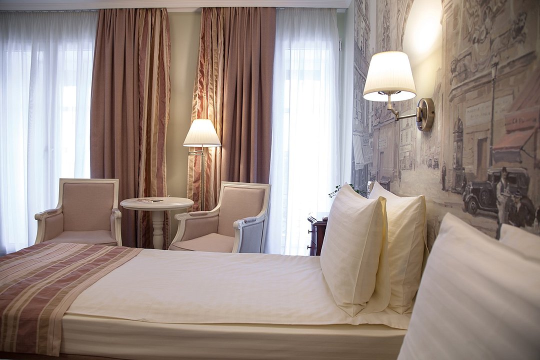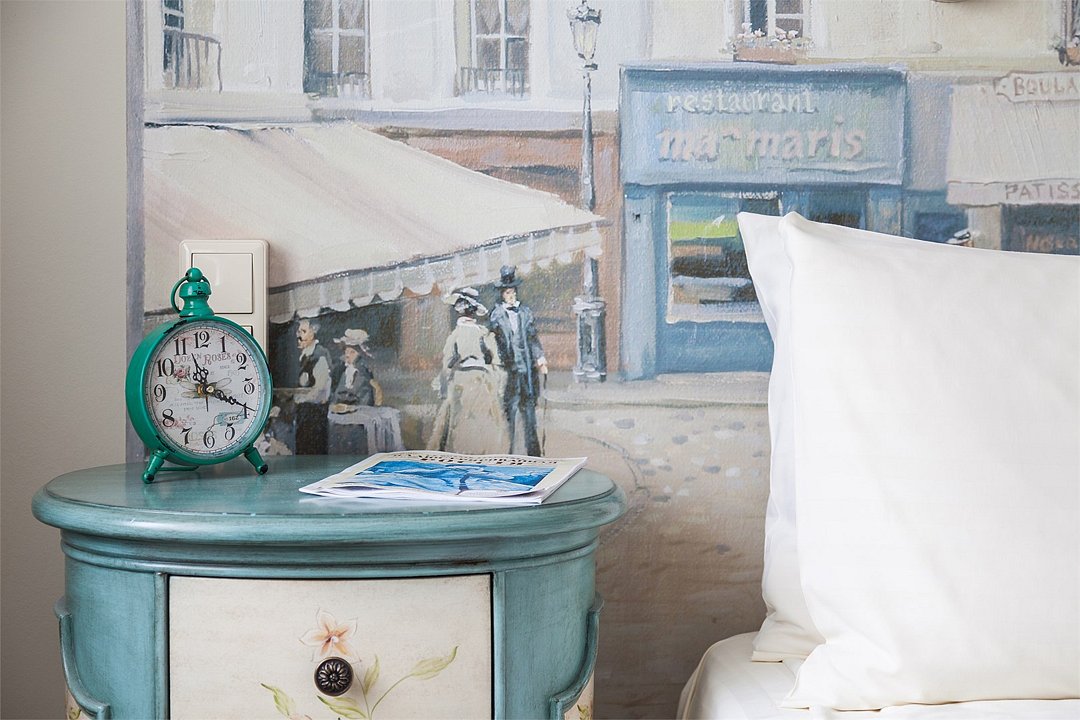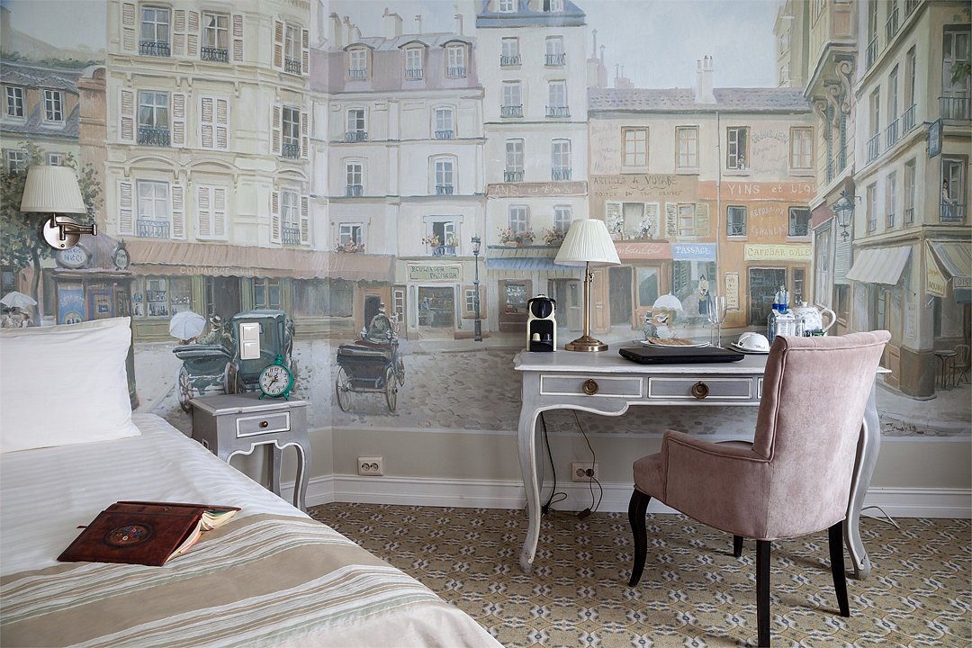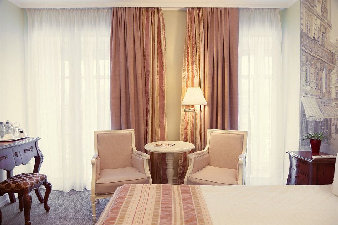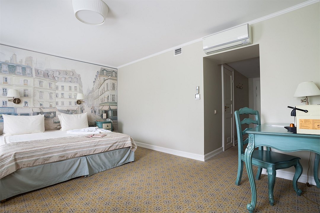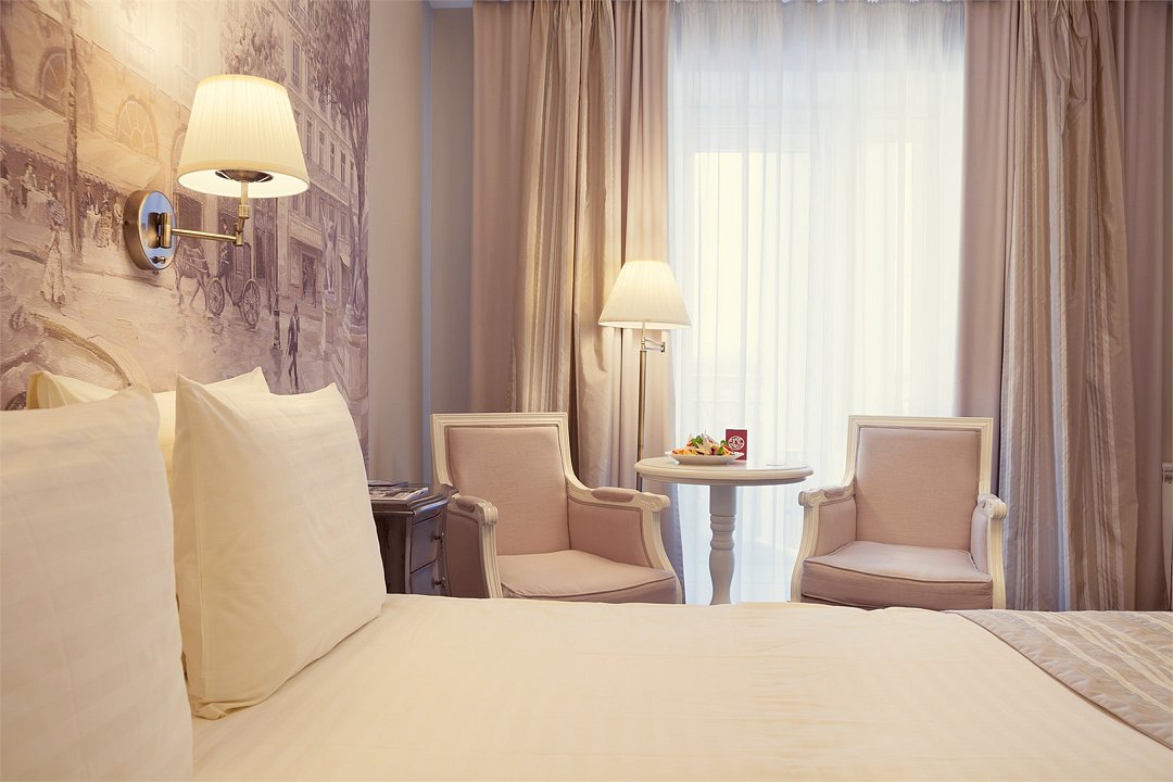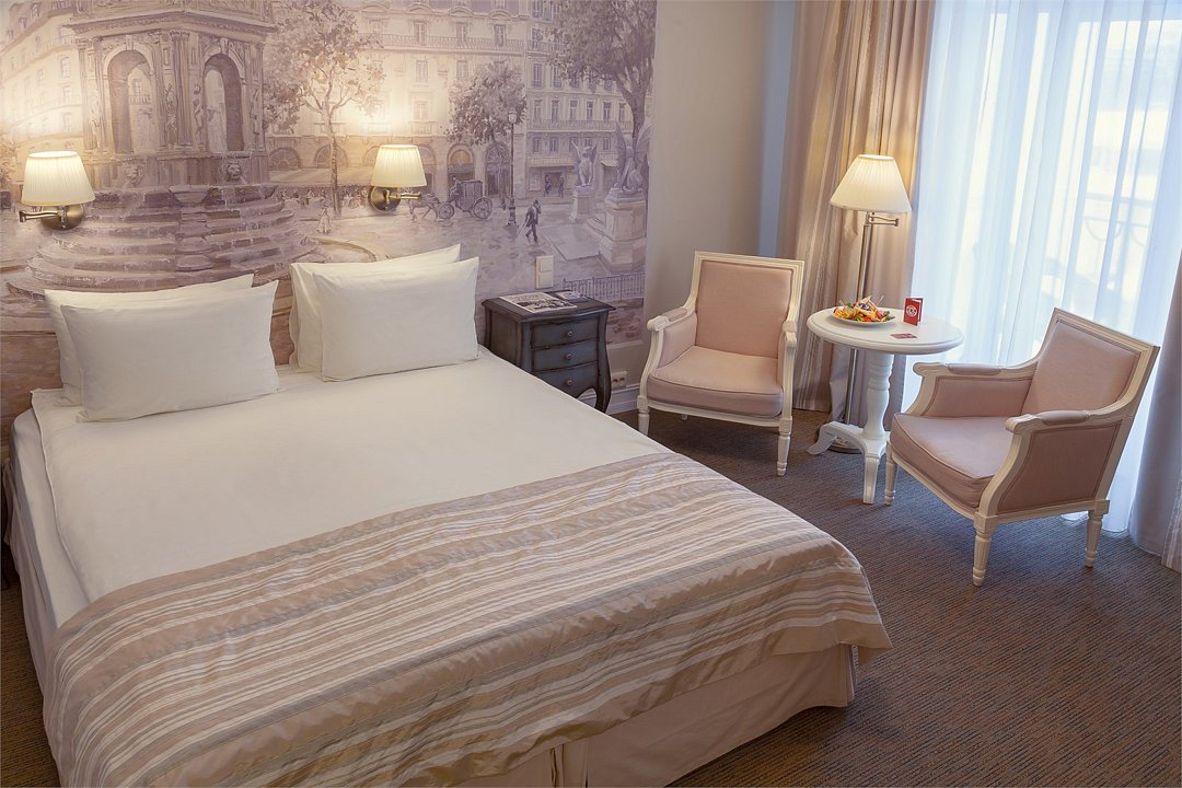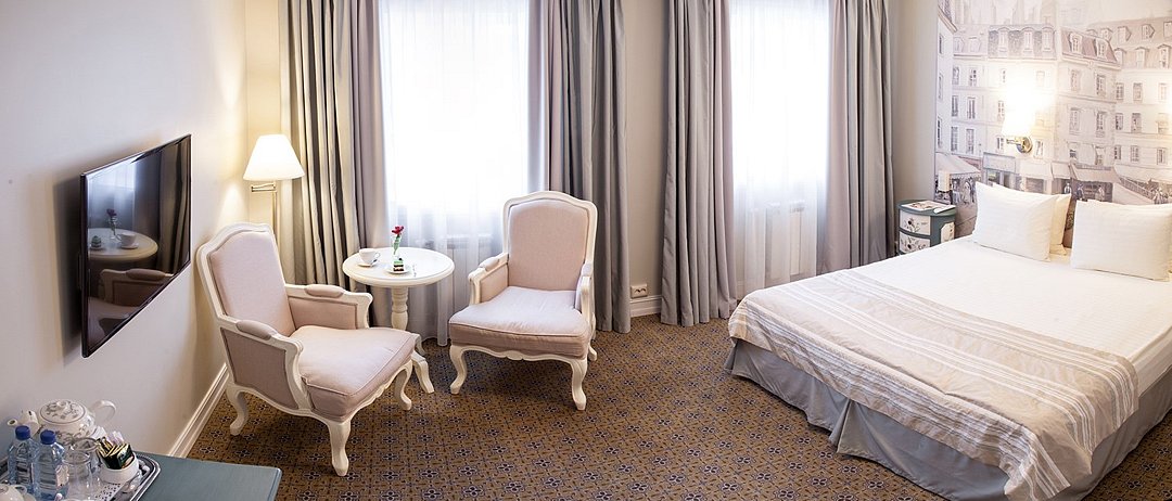 В номерах категории "Стандарт" одна большая двуспальная кровать по умолчанию. Есть возможность предоставить две раздельные кровати, но не во всех номерах; именно эта опция не гарантирована и требует отдельного запроса через комментаирй к брони. Номер категории стандарт, светлый и уютный, приятно удивит комфортом и подарит незабываемые впечатления. Дизайнерская мебель из натурального дерева, мягкие линии, сочетание пастельных тонов в интерьере придают номеру по истине французское очарование и тепло домашней атмосферы.Услуги и удобства