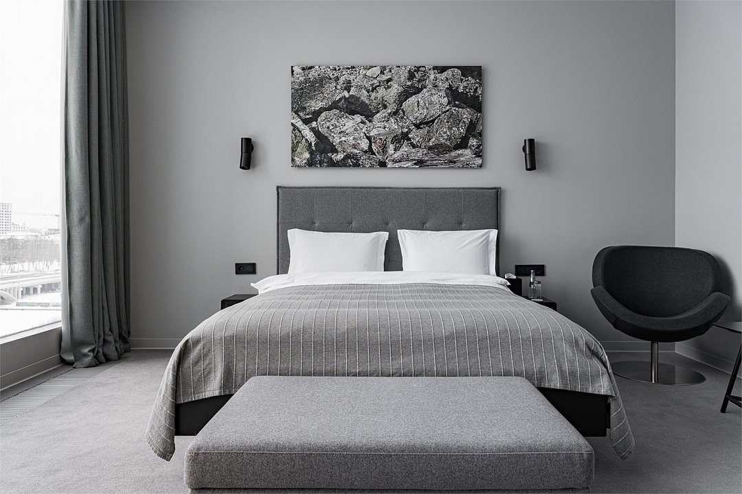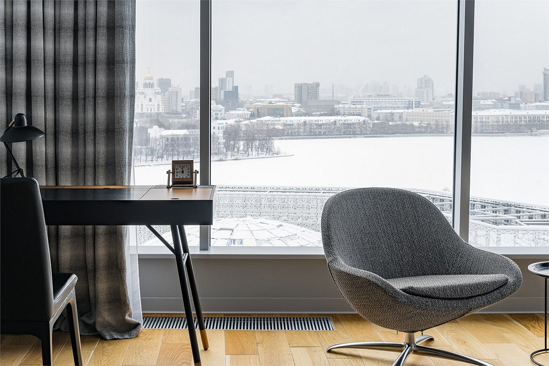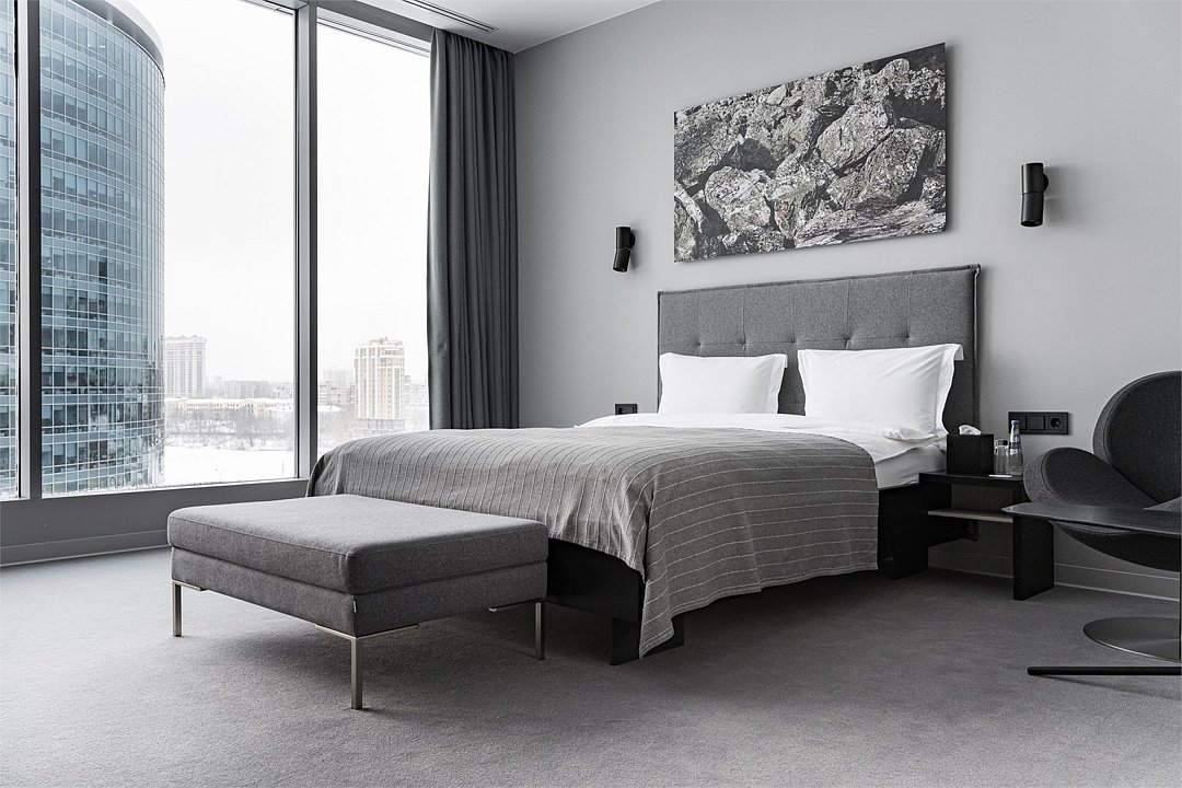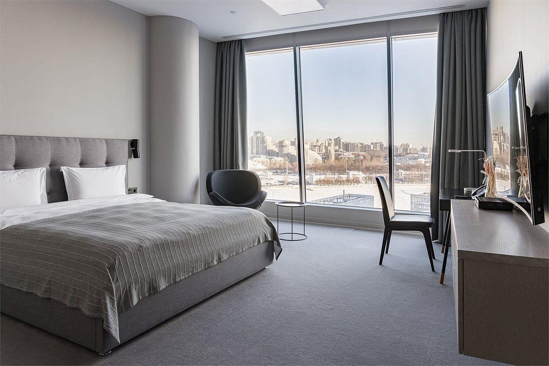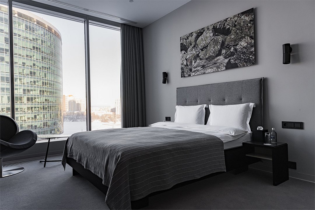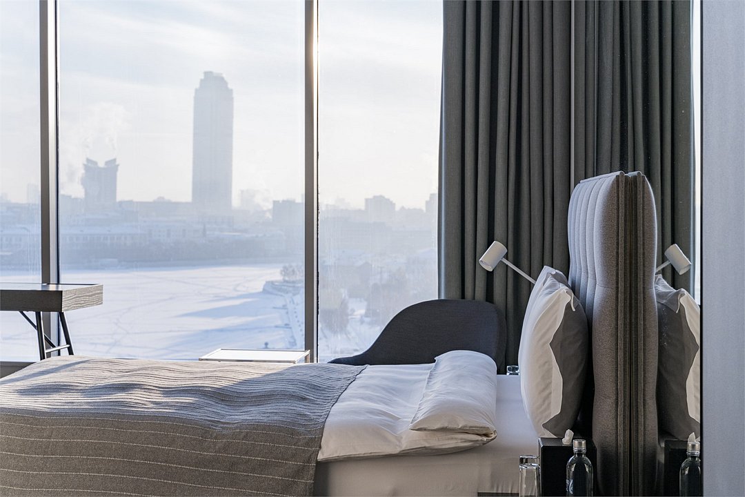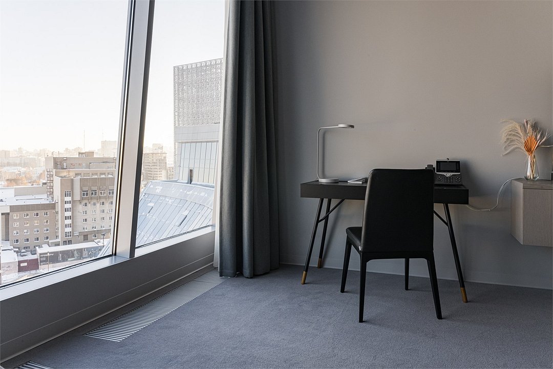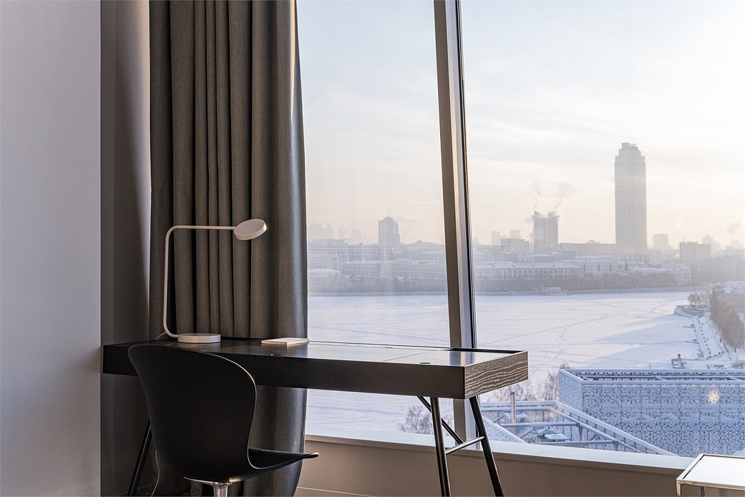 Номер площадью 40 м² с двуспальной кроватью, эргономичной рабочей зоной и ванной комнатой с душевой. Из окон открывается вид на мост, реку Исеть и Екатеринбург-Сити. В номере есть LED телевизор, мини-холодильник с баром и снеками, кофемашина и чайник. Бесплатный Wi-Fi. Отель предлагает в номере гостям наборы гипоаллергенной косметики Naturals Remedies.Услуги и удобства