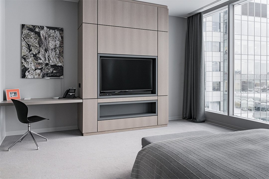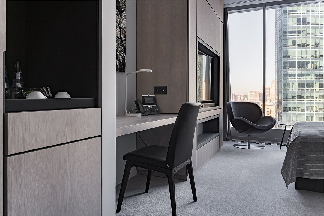 телевизор, Wi-Fi, телефон, кондиционер, система климат-контроля, фен, весы, электронные замки, ванная комната, душевая кабина, банные принадлежности, халаты, тапочки, двуспальная кровать, гипоаллергенное белье, гладильная доска, ортопедический матрас, тумбы, шкаф для одежды, вешалки, письменный стол, эксклюзивная мебель, мини-бар, чайный набор, сейф, чайник, унитаз, раковина, питьевая вода, ковровое покрытие, вид на город, вид на реку, кресло, стаканы, стул, панорамные окна, цифровое тв, телевизор с плоским экраном, мини-холодильник, гостиничная парфюмерияВ номере