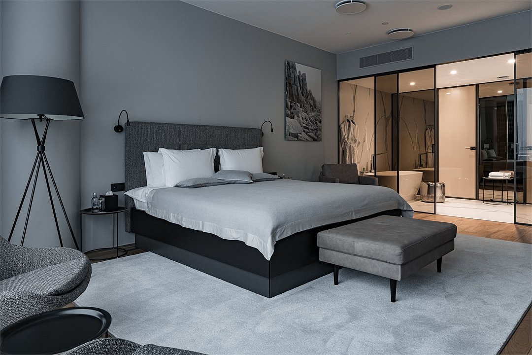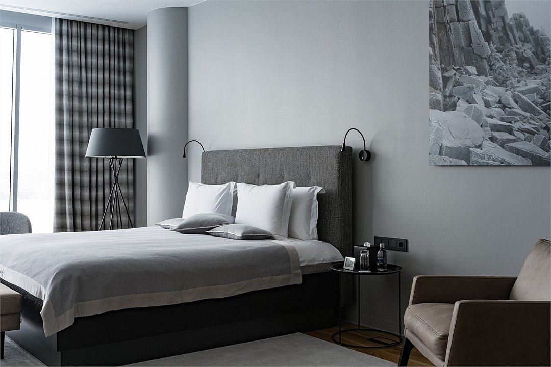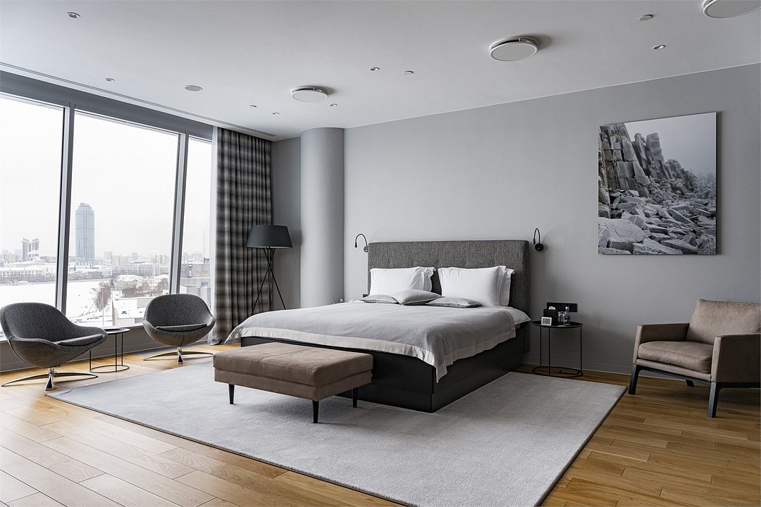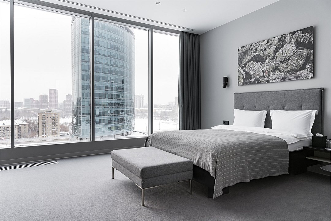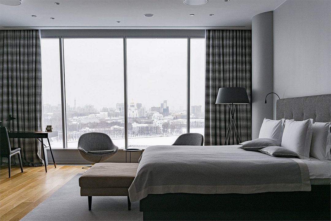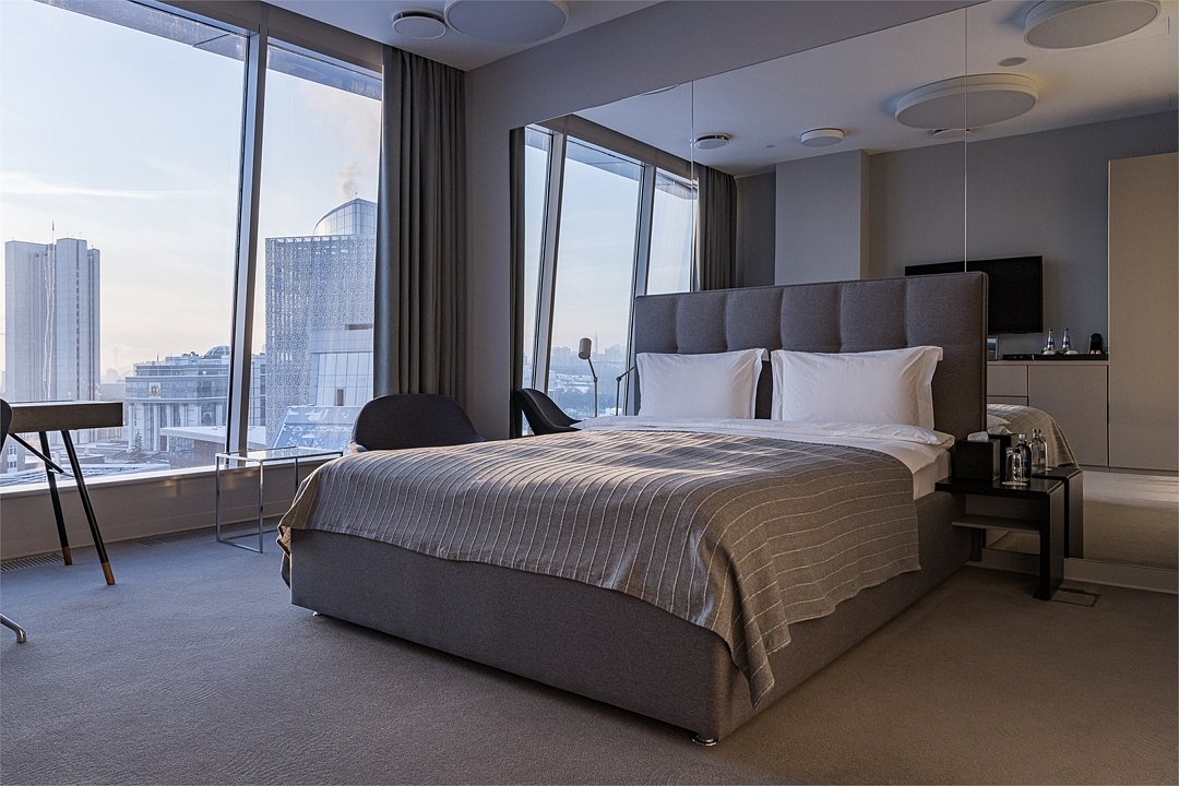 Номер площадью 150 м² с просторной гостиной, спальной комнатой и функциональной гардеробной. Также здесь организовано удобное рабочее место. В ванной комнате отдельно разграничены ванна и душ — это пространство отделено от спальни стеклянной витриной. Из панорамных окон открывается вид на городской пруд. В номере есть Led телевизор, холодильник с мини-баром, кофемашина и чайник. Бесплатный Wi-Fi. Отель предлагает наборы гипоаллергенной косметики Naturals Remedies.Услуги и удобства