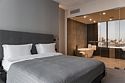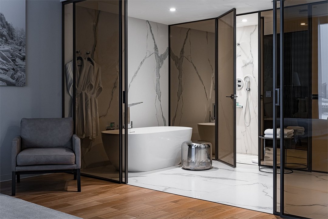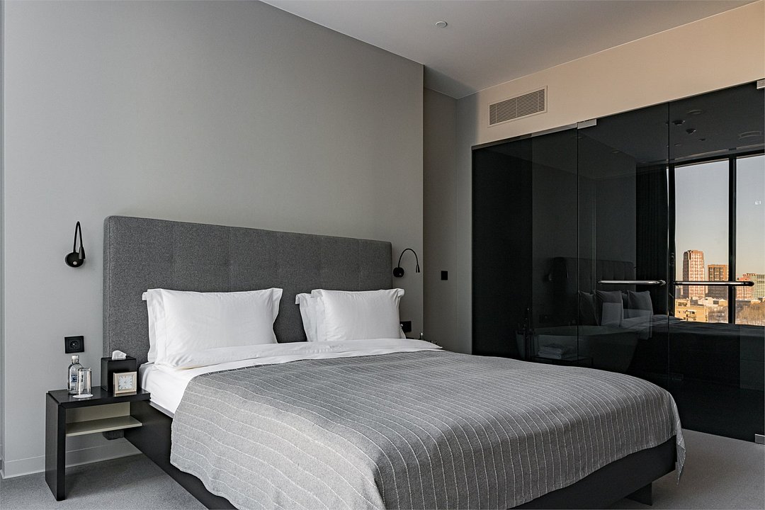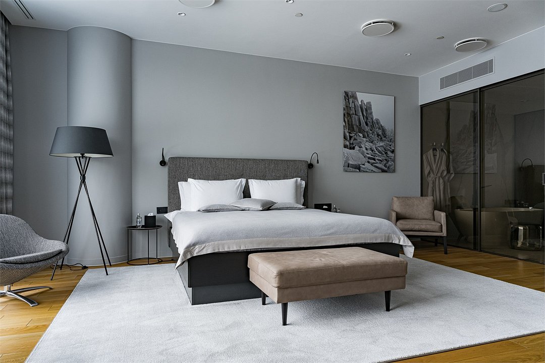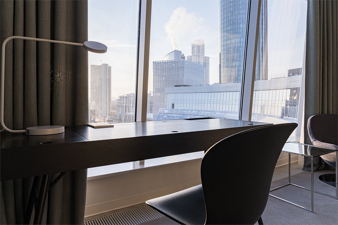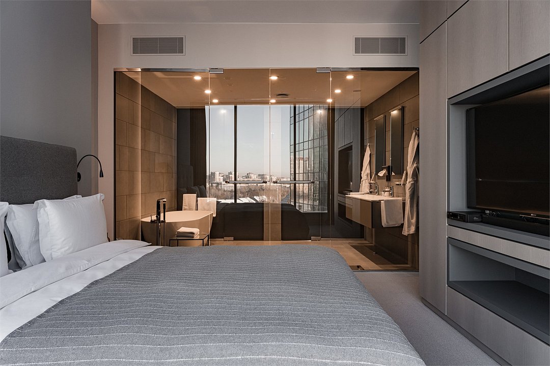 Номер площадью 150 м² с просторной гостиной, спальной комнатой и функциональной гардеробной. Также здесь организовано удобное рабочее место. В ванной комнате отдельно разграничены ванна и душ — это пространство отделено от спальни стеклянной витриной. Из панорамных окон открывается вид на городской пруд. В номере есть Led телевизор, холодильник с мини-баром, кофемашина и чайник. Бесплатный Wi-Fi. Отель предлагает наборы гипоаллергенной косметики Naturals Remedies.Услуги и удобства
