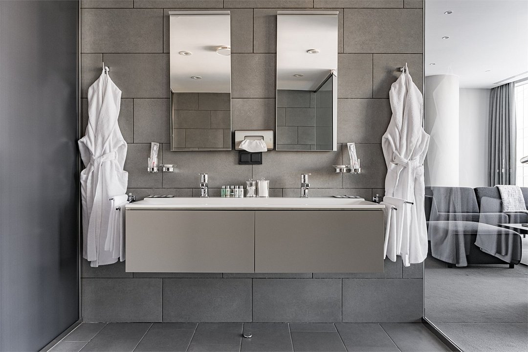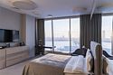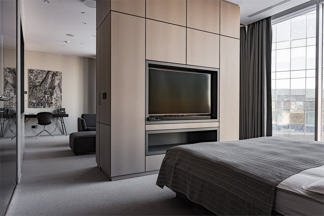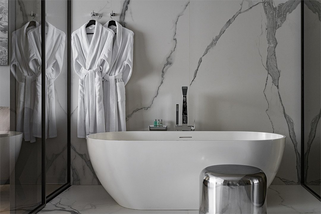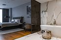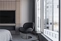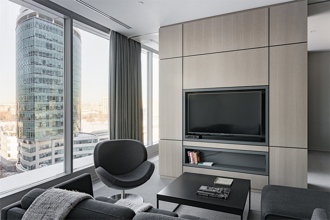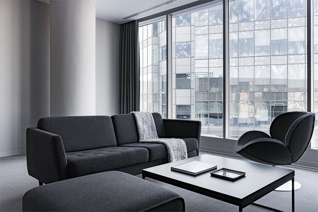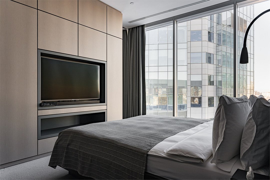 Номер площадью 150 м² с просторной гостиной, спальной комнатой и функциональной гардеробной. Также здесь организовано удобное рабочее место. В ванной комнате отдельно разграничены ванна и душ — это пространство отделено от спальни стеклянной витриной. Из панорамных окон открывается вид на городской пруд. В номере есть Led телевизор, холодильник с мини-баром, кофемашина и чайник. Бесплатный Wi-Fi. Отель предлагает наборы гипоаллергенной косметики Naturals Remedies.Услуги и удобства