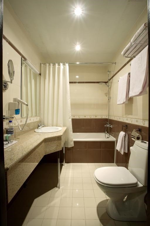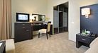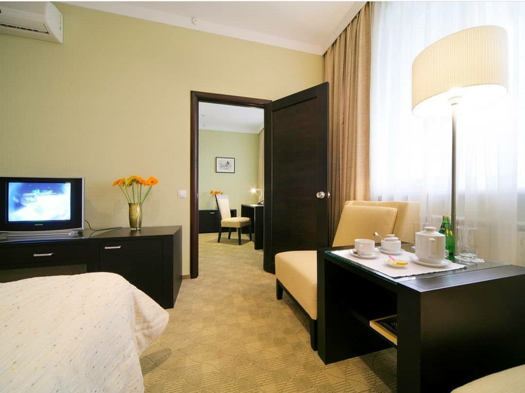 телевизор, спутниковое телевидение, Wi-Fi, телефон, кондиционер, светильник, фен, электронные замки, ванна, халаты, банные полотенца, тапочки, косметические средства, лоджия, двуспальная кровать, тумбы, вешалки, журнальный столик, письменный стол, зеркало, две комнаты, мини-бар, сейф, унитаз, раковина, мягкая мебель, косметическое зеркало, душ, креслоВ гостиничном номере