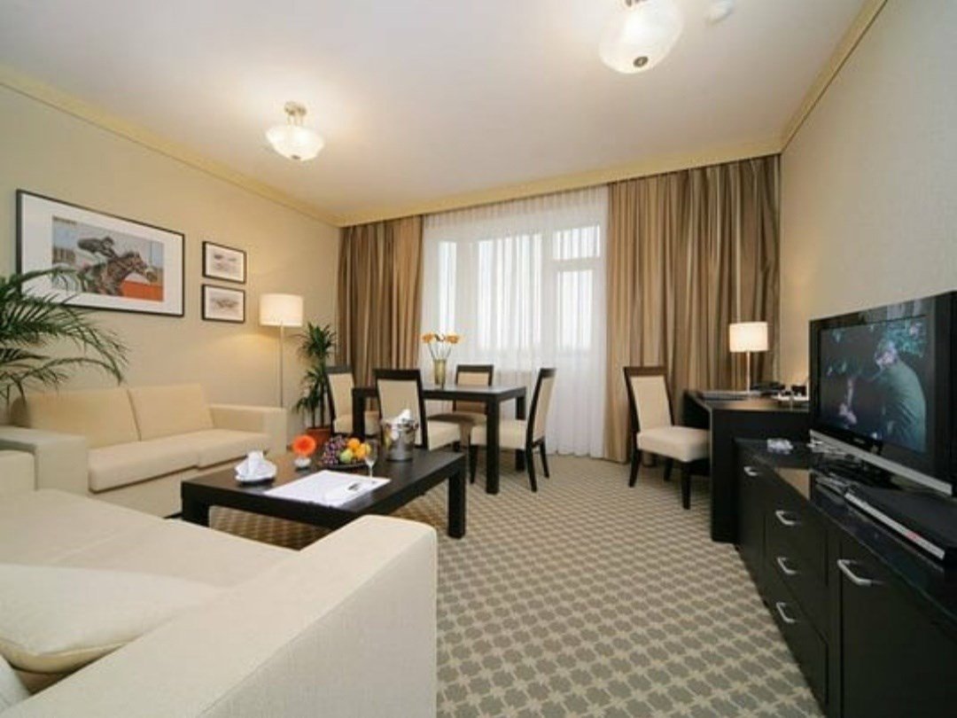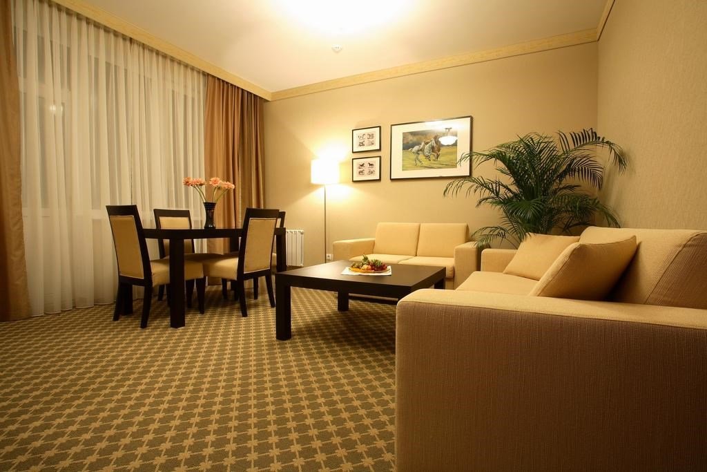 телевизор, спутниковое телевидение, Wi-Fi, телефон, кондиционер, светильник, фен, электронные замки, ванна, халаты, банные полотенца, тапочки, косметические средства, двуспальная кровать, тумбы, вешалки, журнальный столик, письменный стол, зеркало, две комнаты, мини-бар, сейф, унитаз, раковина, мягкая мебель, косметическое зеркало, душ, креслоВ гостиничном номере