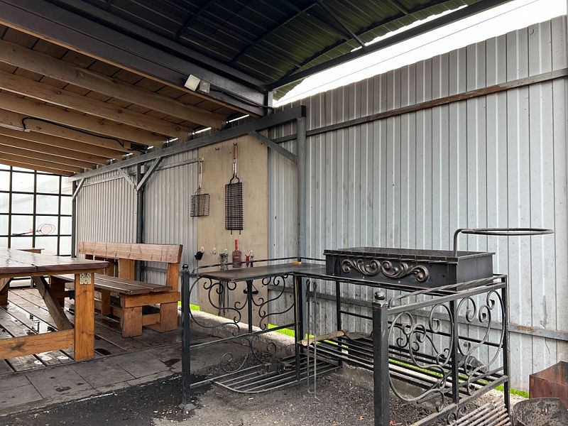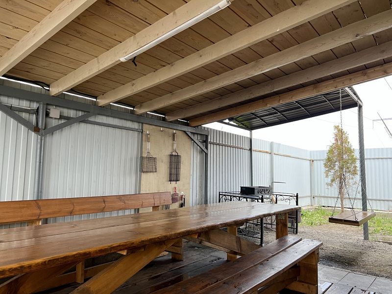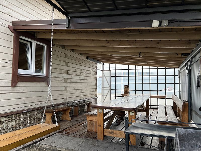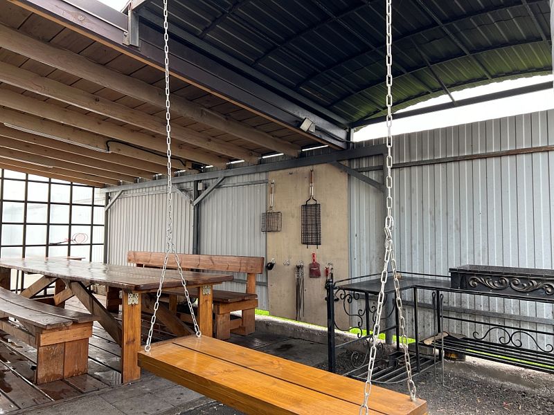 На территории находится просторная беседка с качелями и мангальная зона. Участок огорожен забором.