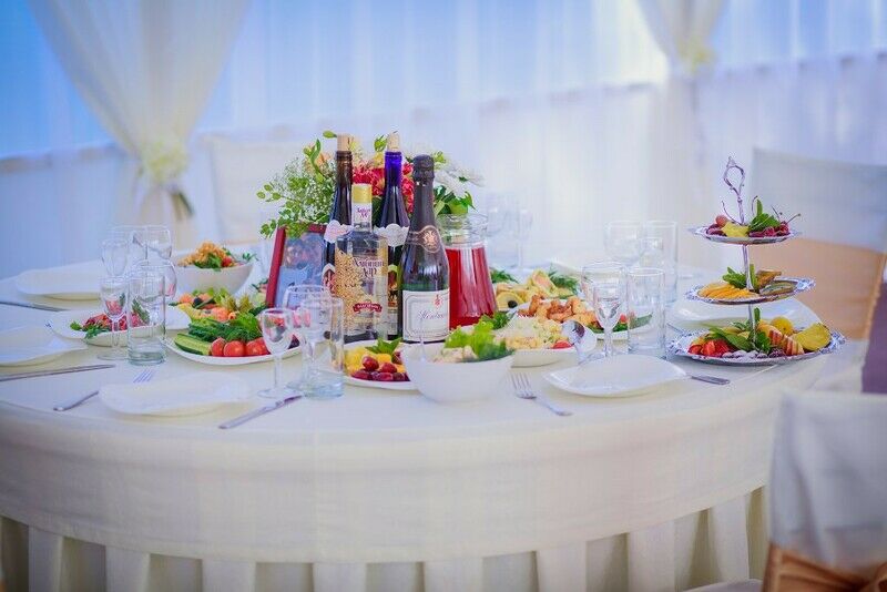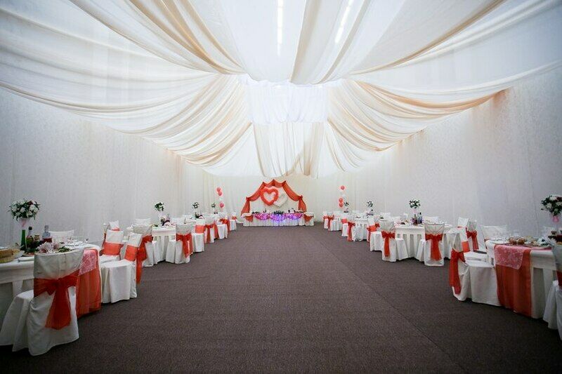 Скатерти, чехлы на стулья, золотые банты на стулья.Большой банкетный зал