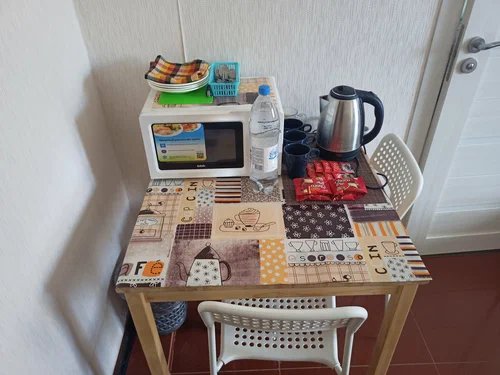 Комфортный номер с двуспальной кроватью, балконом, собственной ванной комнатой и мини-кухней. В номере имеются кондиционер, ТВ, чайник, микроволновая печь и фен.В номере