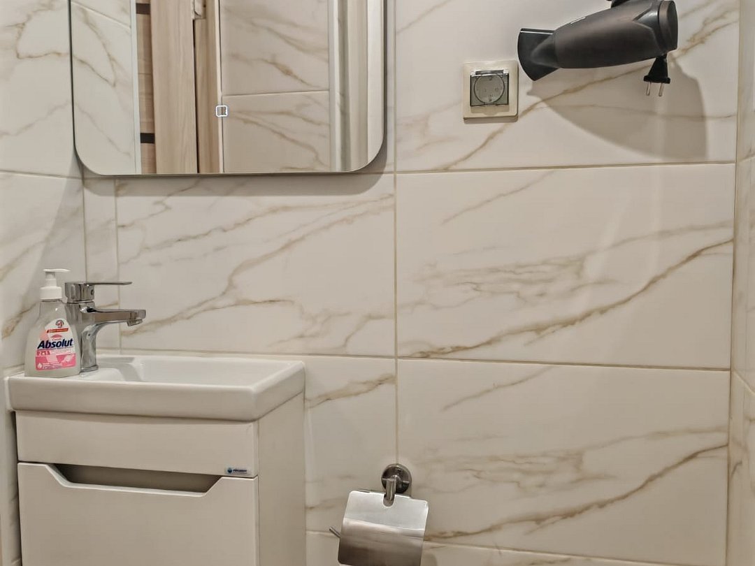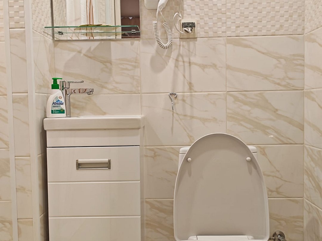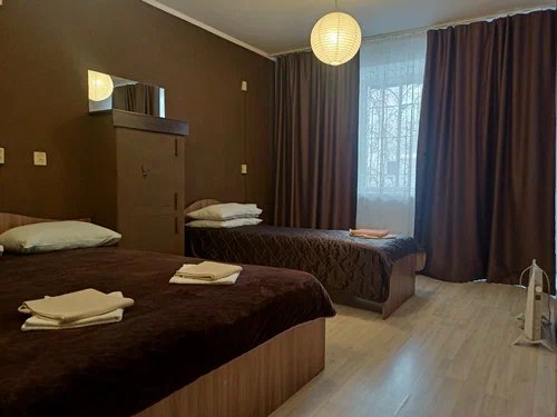 Комфортный трехместный семейный номер с собственной ванной комнатой. В номере одна двуспальная 160*200см и одна односпальная кровати, мини-холодильник, чайник, микроволновка и ТВ. В ванной комнате имеются стиральная машина, гладильные принадлежности, сушилка для белья.В номере