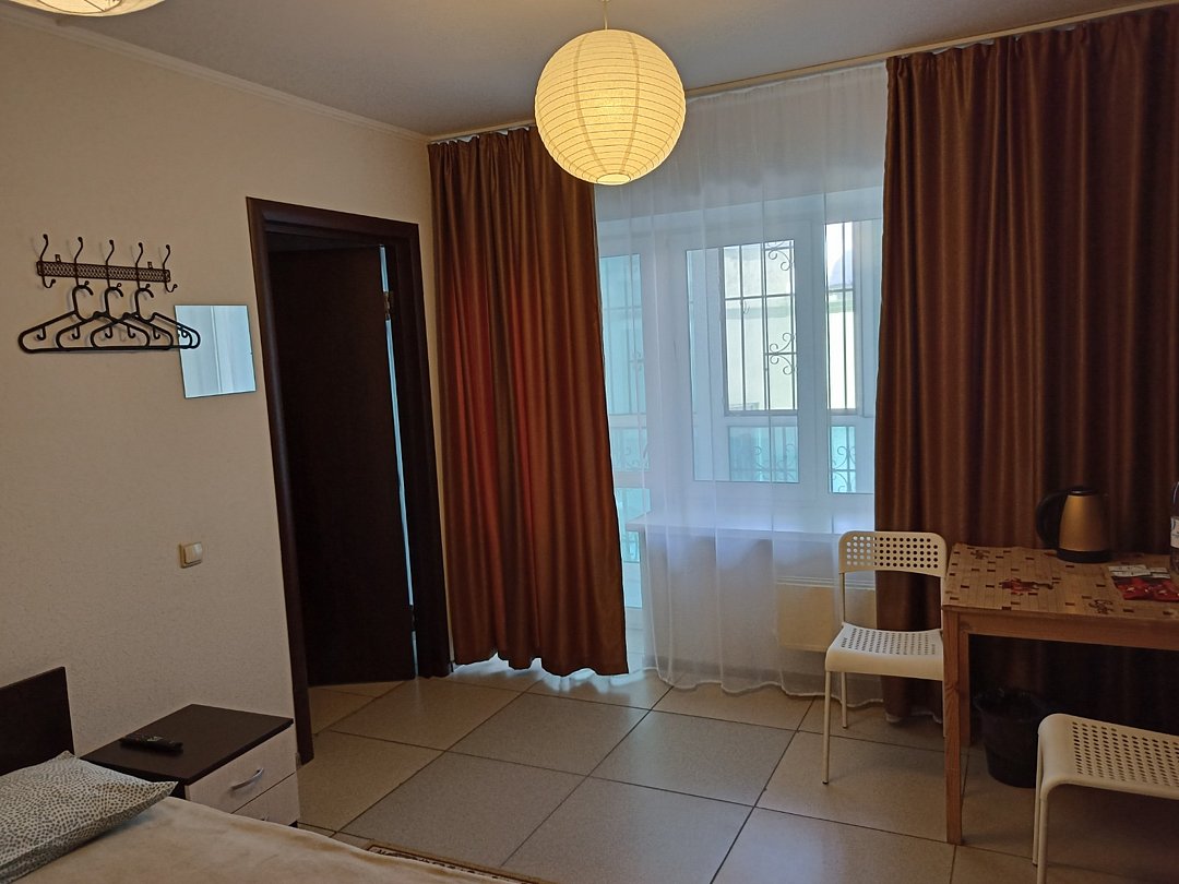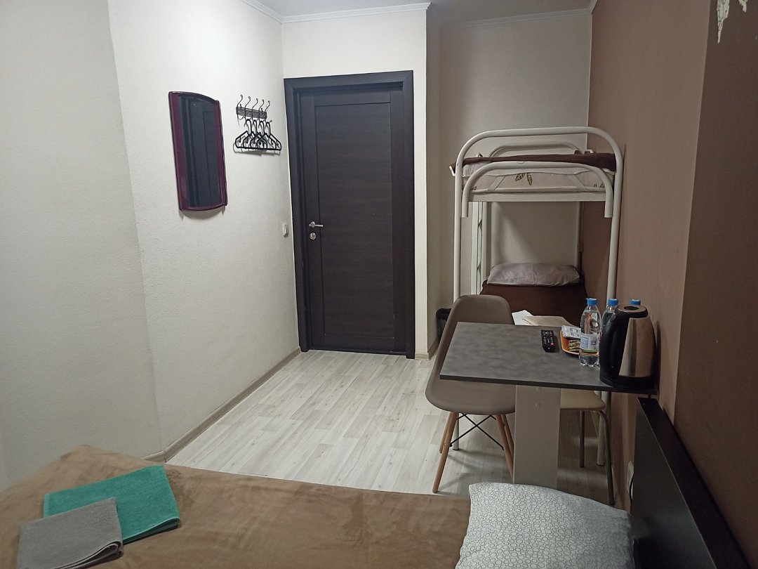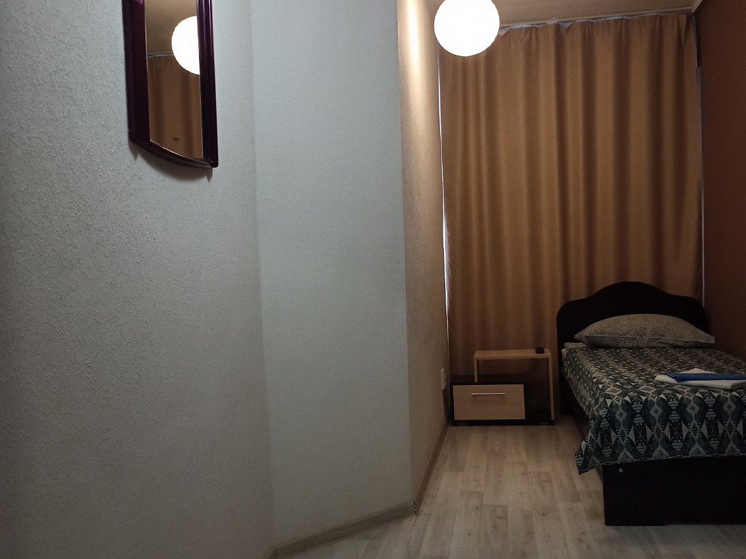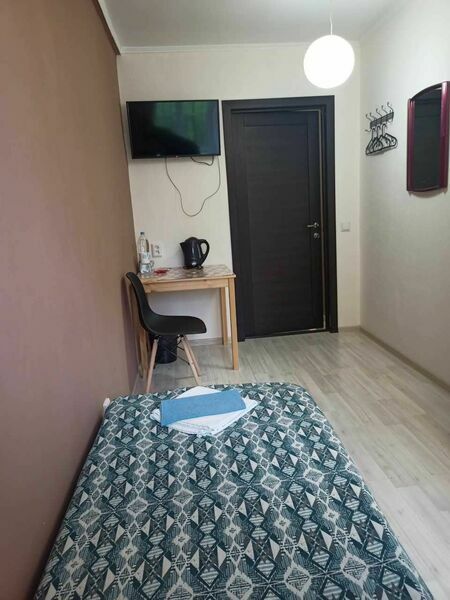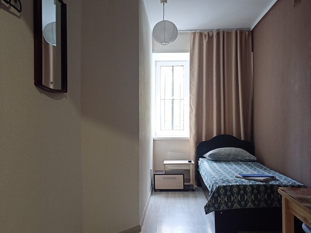 Одноместный номер эконом с общими удобствами. В номере одна односпальная кровать, ТВ, чайник, окно. Душевые и туалетные комнаты расположены на этаже. Стойка регистрации работает с 9:00 до 21:00.В номере