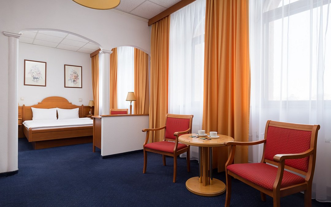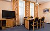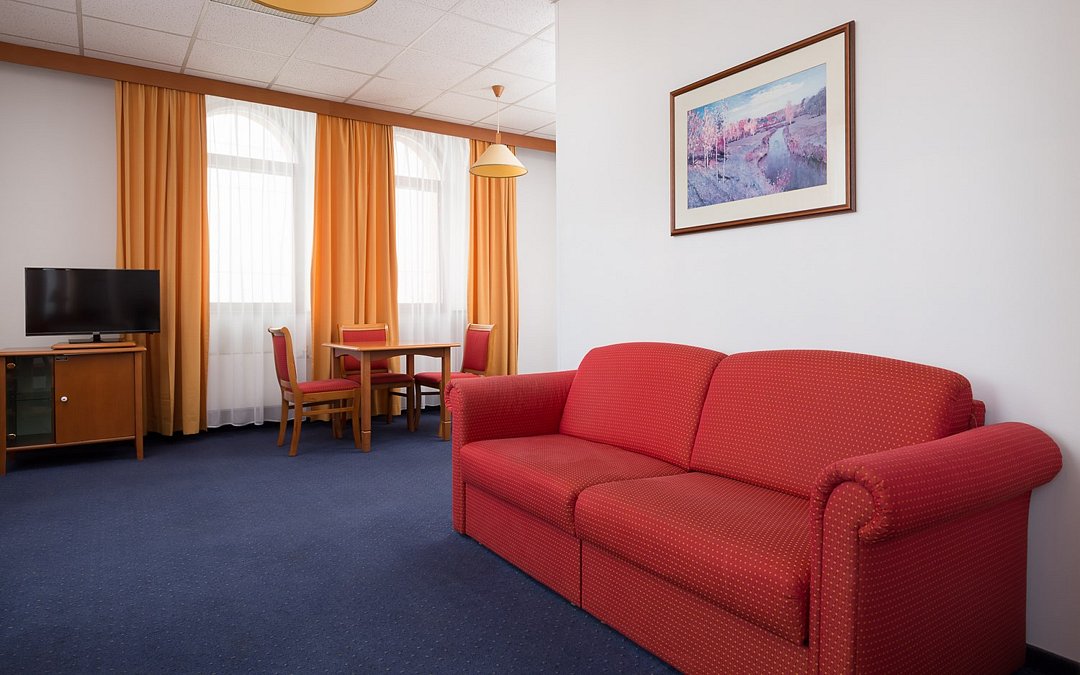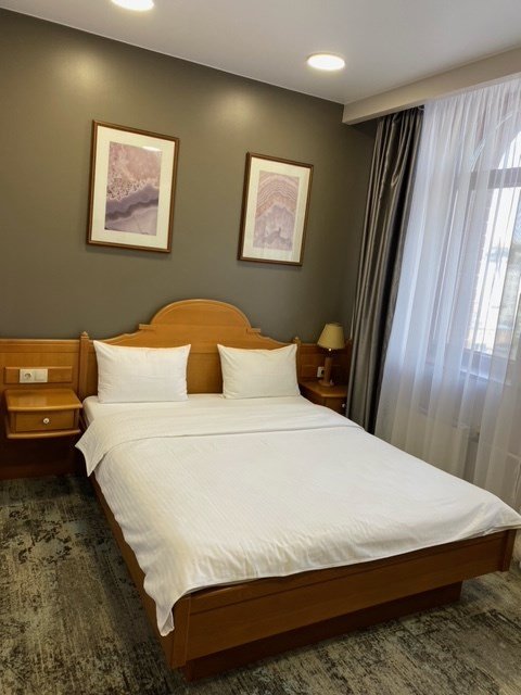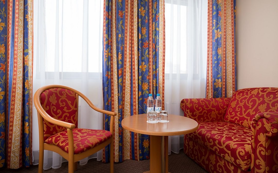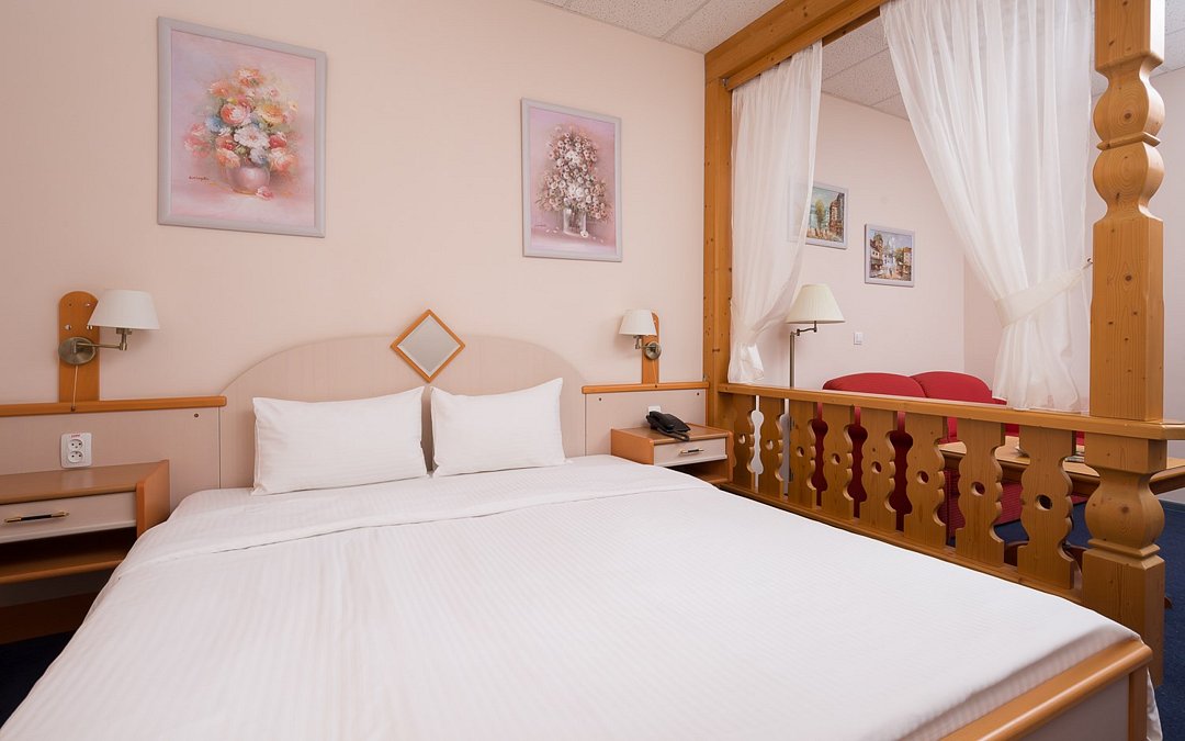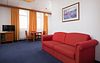 Двухкомнатный номер с одной двуспальной кроватью (165см х 205 см ) и диваном. В ванной комнате: ванна, туалет, фен, комплект полотенец, халат, тапочки, косметические принадлежности. Проживание детей до 7 лет включено в стоимость.Услуги и удобства