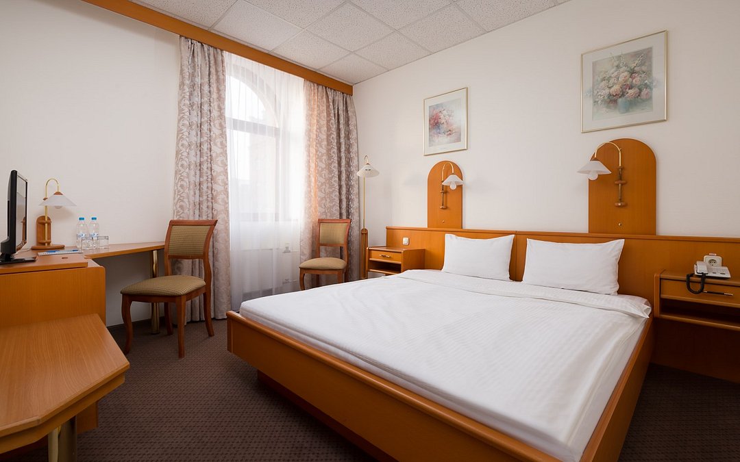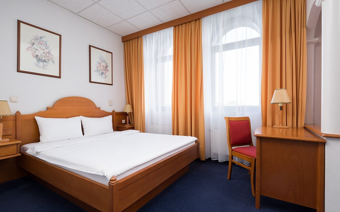 Номер с одной двуспальной кроватью (180 см х 200 см) . Площадь номера - 22 м2. В ванной комнате: ванна с душем, туалет, фен, комплект полотенец, косметические принадлежности. Проживание детей до 7 лет включено в стоимость (без предоставления дополнительного места).Услуги и удобства