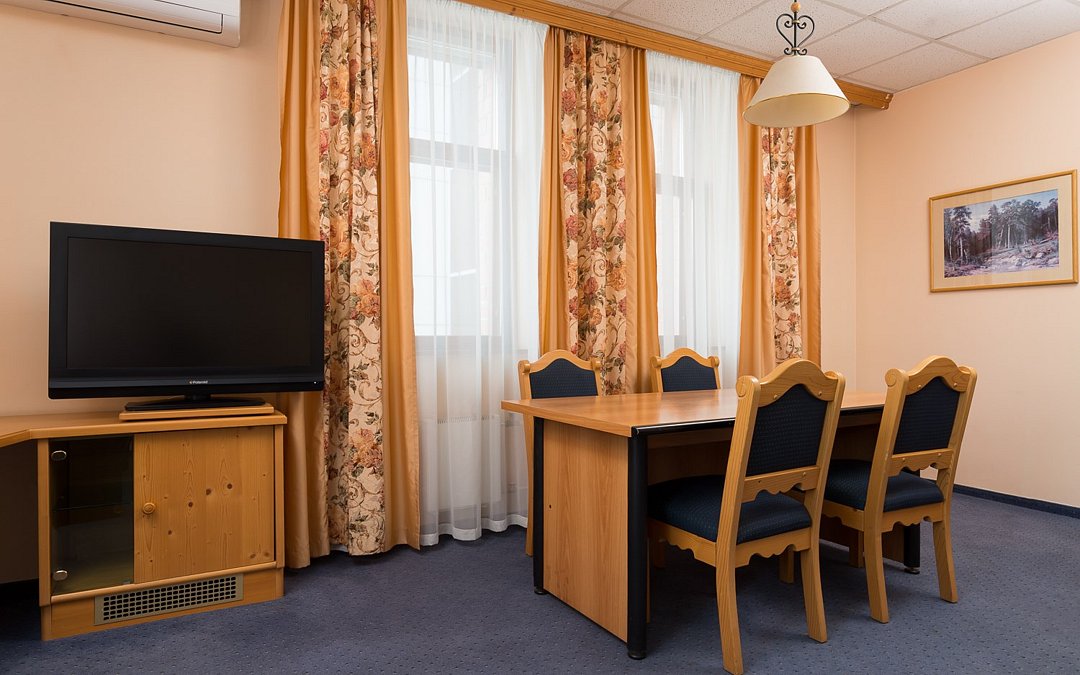 Однокомнатный номер с одной двуспальной кроватью (186 см х 206 см) или с двумя кроватями (90 см х 200 см). Площадь номера - 30,5 м2. Джуниор Сюит - это однокомнатный номер, площадью 30,5 м2, разделенный декоративной деревянной перегородкой на спальную зону, рабочую зону и зону отдыха, имеется возможность комфортного трехместного размещения (в зоне отдыха раскладывается диван). В ванной комнате: ванна, туалет, фен, комплект полотенец, тапочки, косметические принадлежности. Проживание детей до 7 лет включено в стоимость (без предоставления отдельного спального места).Услуги и удобства
