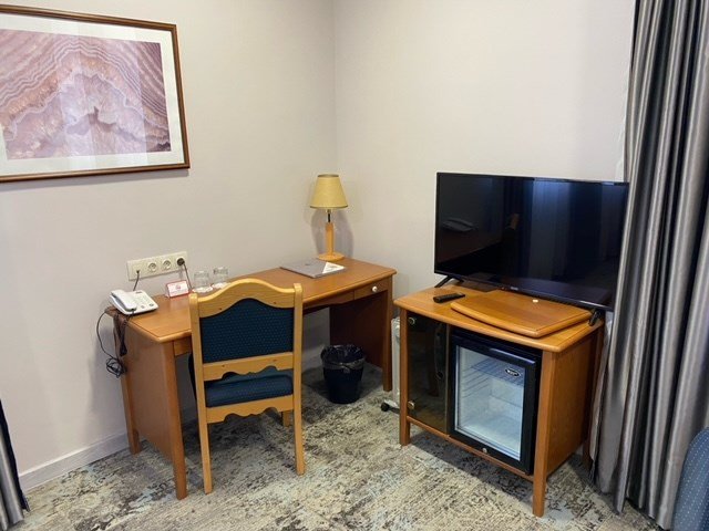 телевизор, Wi-Fi, телефон, холодильник, кондиционер, светильник, фен, электронные замки, ванна, санузел, банные полотенца, односпальная кровать, стулья, шкаф для одежды, вешалки, письменный стол, багажная тумба, зеркало, мини-бар, унитаз, раковина, вид во дворВ гостиничном номере