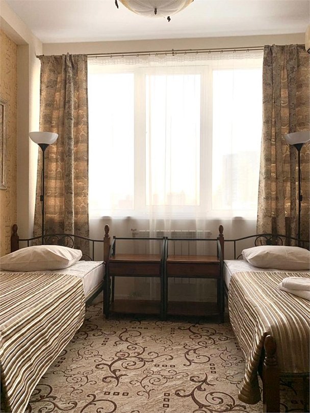 телевизор, Wi-Fi, холодильник, светильник, фен, микроволновая печь, утюг, ванная комната, душевая кабина, банные полотенца, гигиенические средства, две односпальные кровати, гладильная доска, шкаф для одежды, вешалки, зеркало, комод, чайный набор, обслуживание номеров, чайник, унитаз, раковина, вид на город, стаканы, стул, стол, тумба, туалетные средства, цифровое тв, набор для приготовления чая и кофе, вешалки-плечики, бутилированная вода, без питомцевВ номере