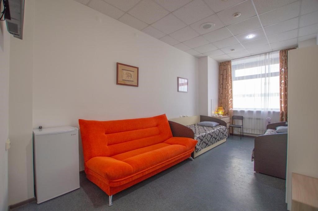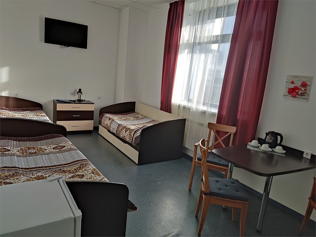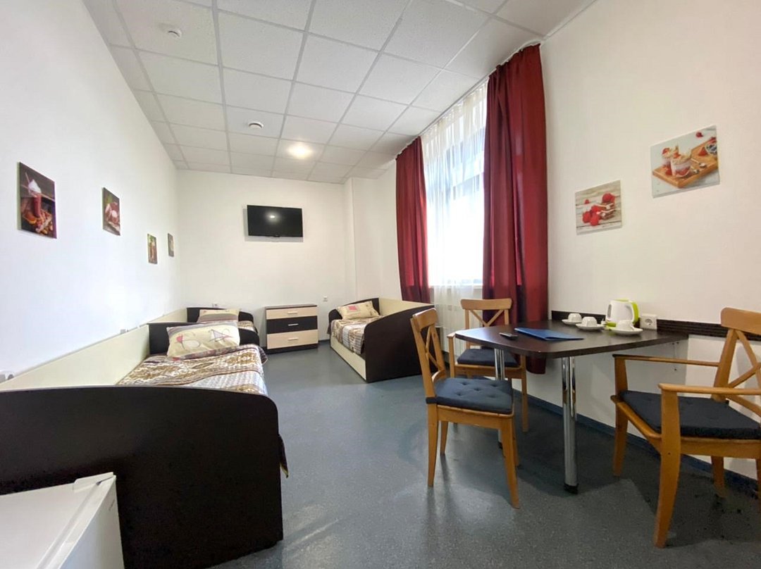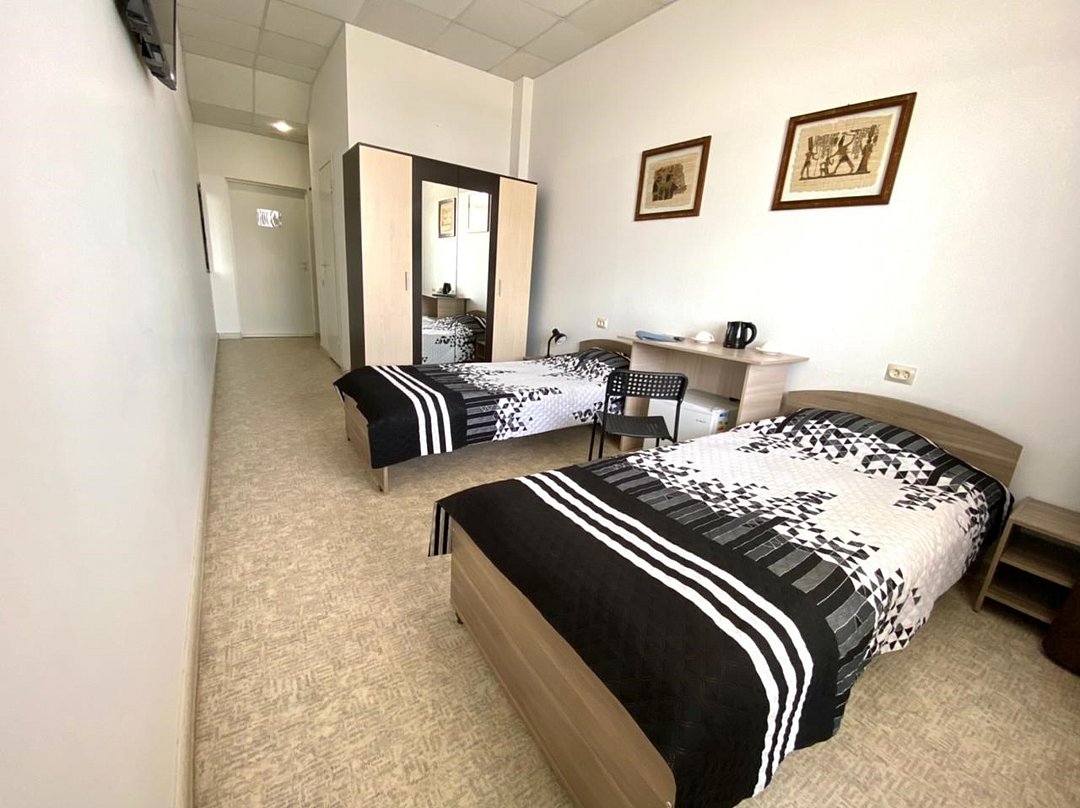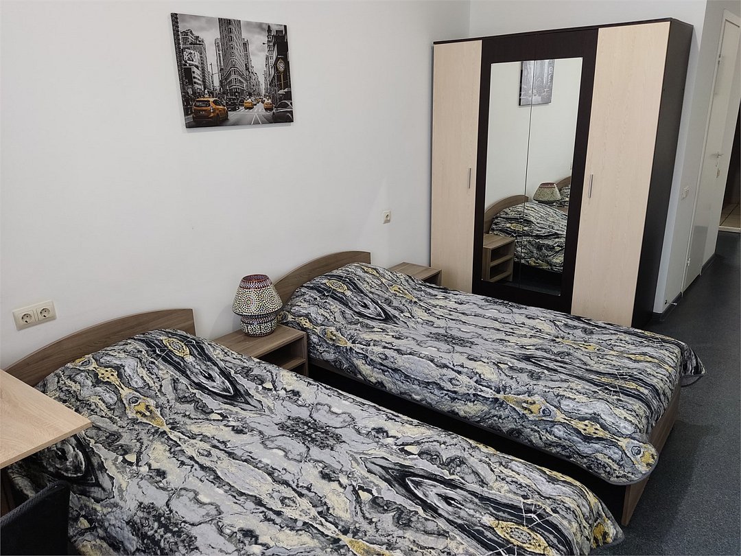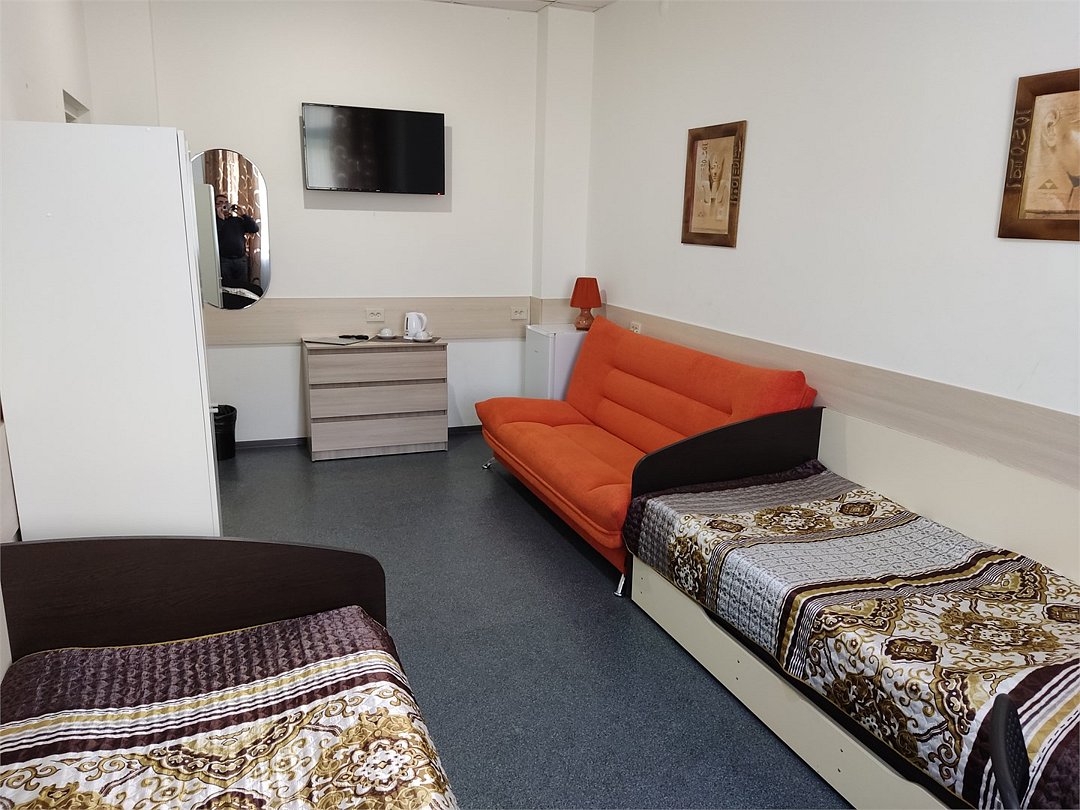 В номере диван, кровати с ортопедическим матрасам, цифровое тв, телевизор с плоским экраном, мини-холодильник, настольная лампа, зеркало, комод, письменный стол, стулья, тумбы, шкаф для одежды. Туалетные средства, банные полотенца,. Душевая кабина вне номера. Вид на город Wi-Fi, интернет Есть гостиная зона. Так же Гости могут воспользоваться феном, гладильной доской, утюгом и услугами прачечной.Услуги и удобства