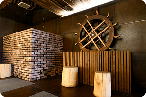 В центре пространства парной — электрическая печь «Мельница», возможно, самая необычная электропечь на планете Земля. Она обладает собственным мельничным колесом, которое зачерпывает воду из расположенного сзади желоба, как ковшом.