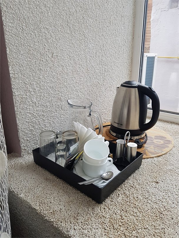 кабельное телевидение, светильник, фен, будильник, радио, обогреватель, санузел, водонагреватель, банные полотенца, тапочки, гигиенические средства, кровать «Queen size», стулья, шкаф для одежды, вешалки, багажная тумба, чайный набор, набор посуды, обслуживание номеров, чайник, раковина, мягкая мебель, косметическое зеркало, питьевая вода, отопление, душ, плиточное покрытие, вид во двор, стаканы, столовые приборы, стол, туалетные средства, внутренний телефон, телевизор с плоским экраном, можно с питомцамиВ номере
