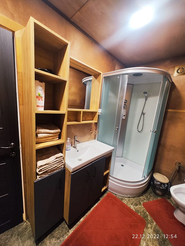- спальня с панорамным видом на горы 12 кв.м. с очень огромной и удобной кроватью 200х200 см, встроенной в основание дома, с огромным местом для хранения ваших вещей, полки для вещей, светильники.