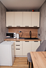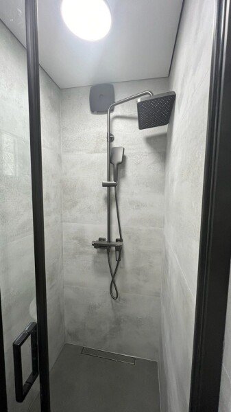 Домик площадью 30 м² подходит для комфортного размещения до четырех гостей. На первом этаже расположены санузел и душевая кабина, оснащенные всем необходимым: гигиеническими принадлежностями (мочалка, зубные принадлежности, шампуни, гель для душа, лосьон для тела и кондиционер), настенным конвектором, зеркалом с подсветкой и феном.