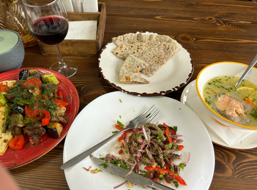 На территории гостевого дома имеется пруд с живой форелью, баня с купелью, а также беседки. Также имеется кафе с панорамным видом на горы и разнообразным меню национальной и европейской кухни.