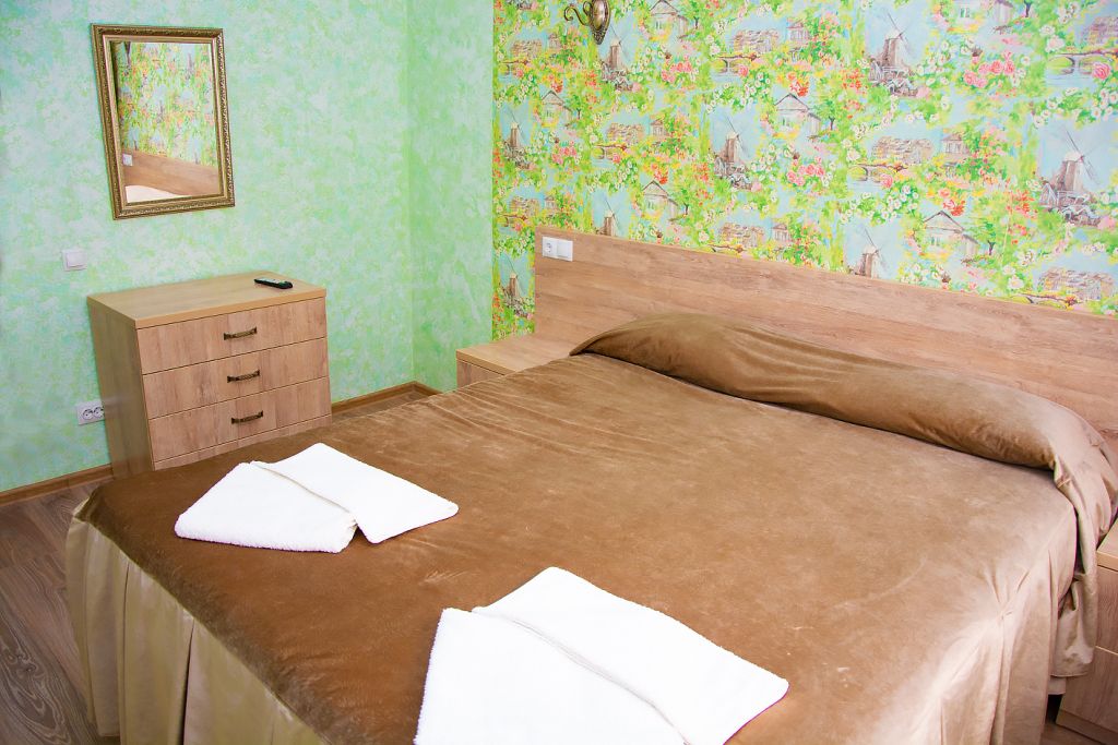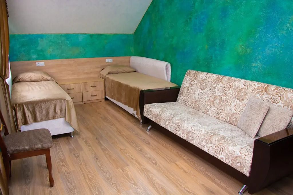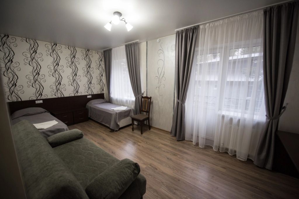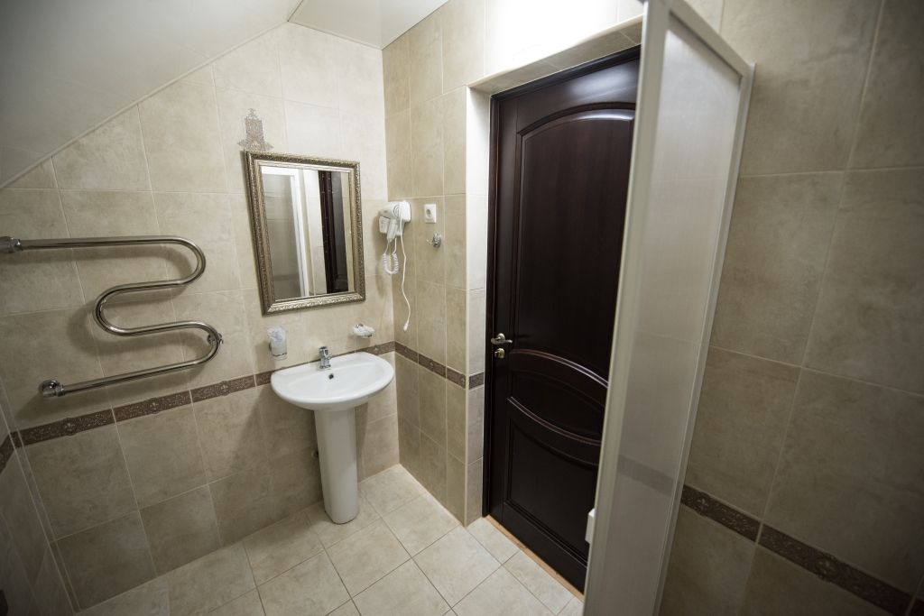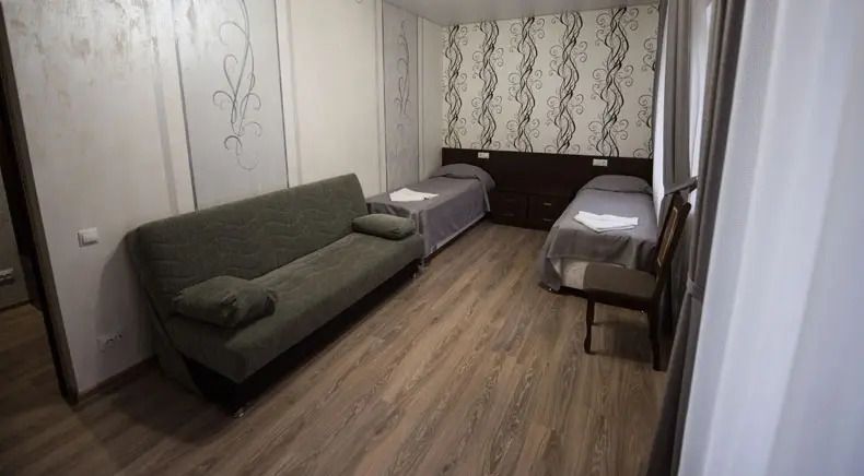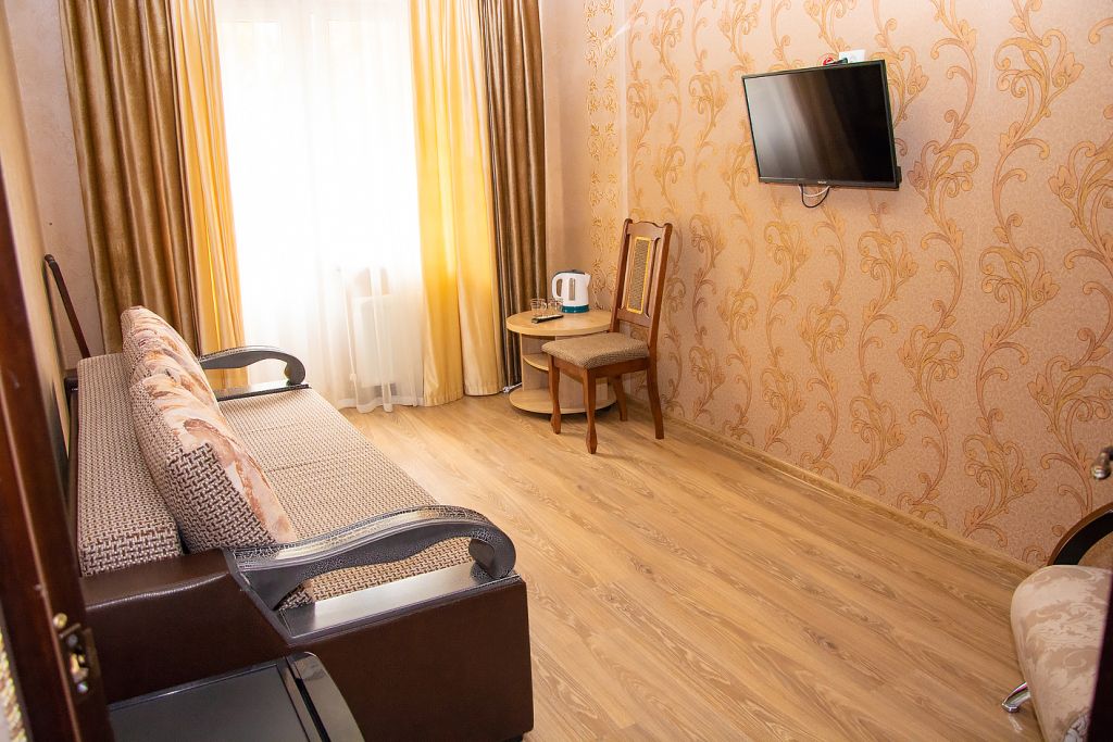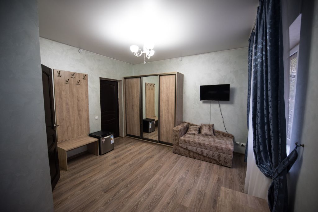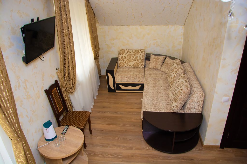 Две кровати, прикроватная тумбочка и просторный диван создают особую обстановку комфорта, приближенную к домашним условиям. Номер обеспечен всем необходимым, в том числе телевизором и электрочайником. В номере есть душевая кабина, умывальник, унитаз, а само помещение санузла отделано современной керамической плиткой.