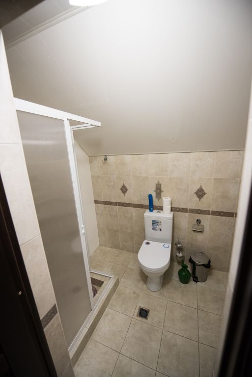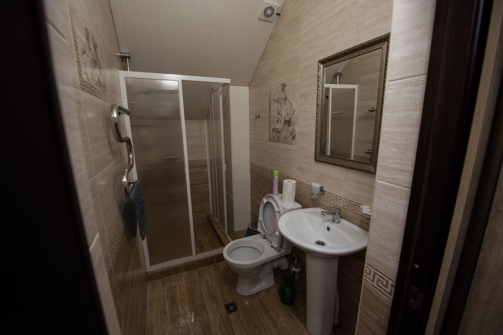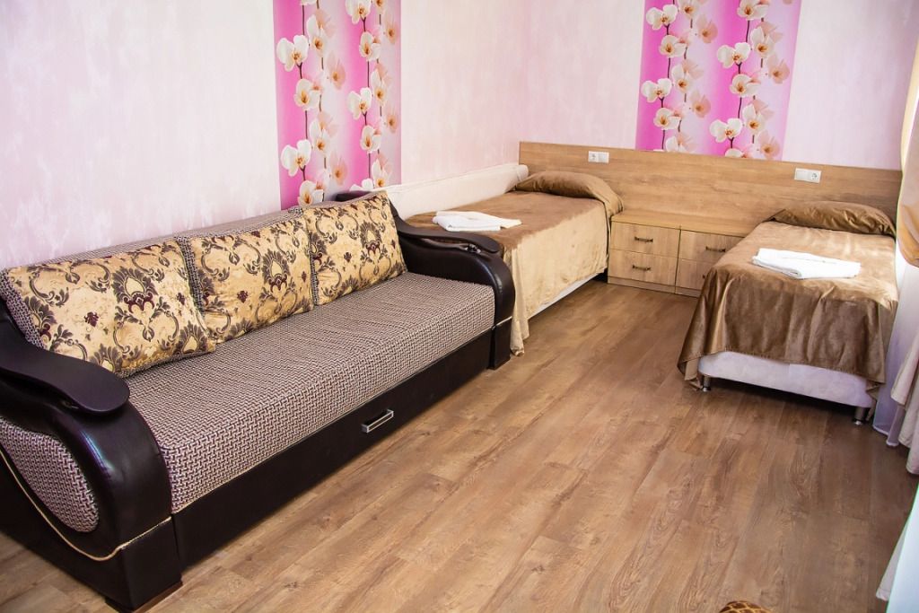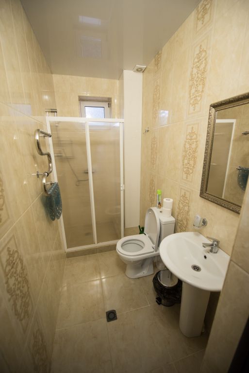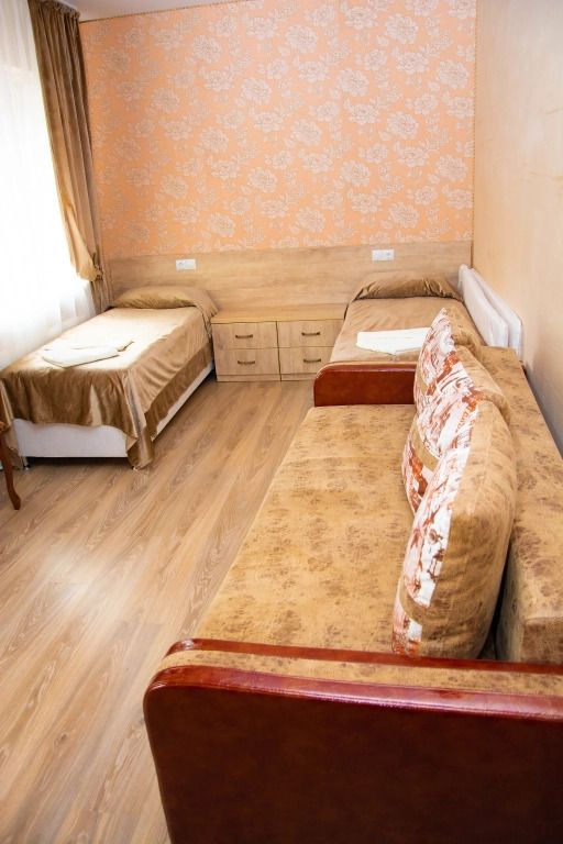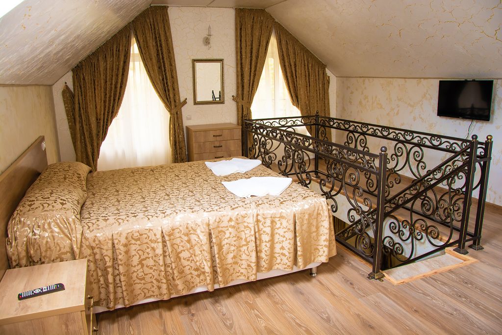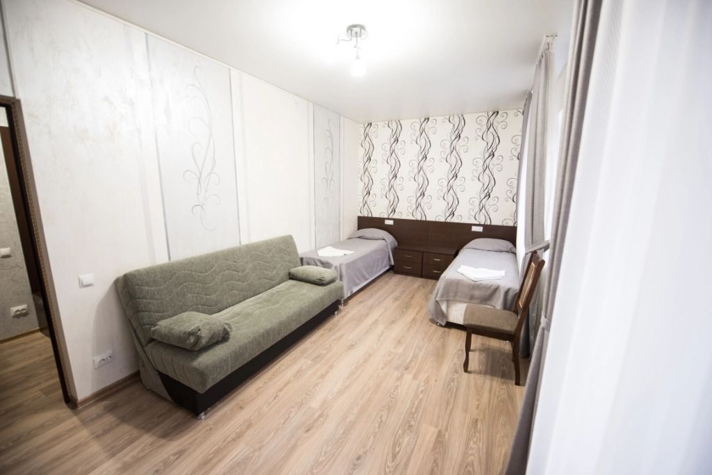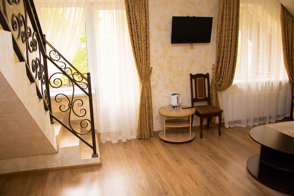 Две кровати, прикроватная тумбочка и просторный диван создают особую обстановку комфорта, приближенную к домашним условиям. Номер обеспечен всем необходимым, в том числе телевизором и электрочайником. В номере есть душевая кабина, умывальник, унитаз, а само помещение санузла отделано современной керамической плиткой.