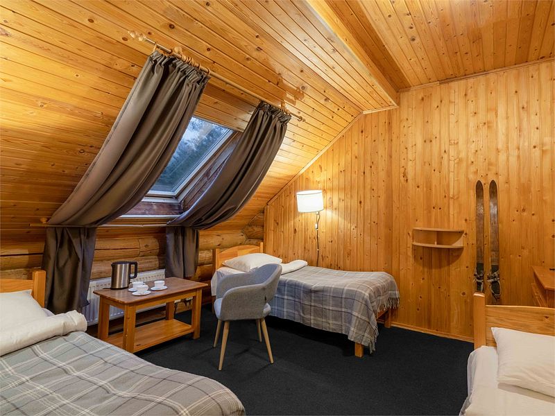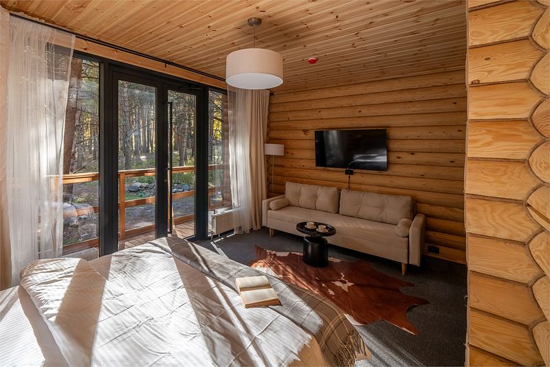Двухкомнатный номер повышенной комфортности, максимальной вместимости 4 человека. В спальной комнате — двуспальная кровать и большое окно с видом на сосновый лес. Есть возможность размещения в гостиной на дополнительном месте – раскладном диване.