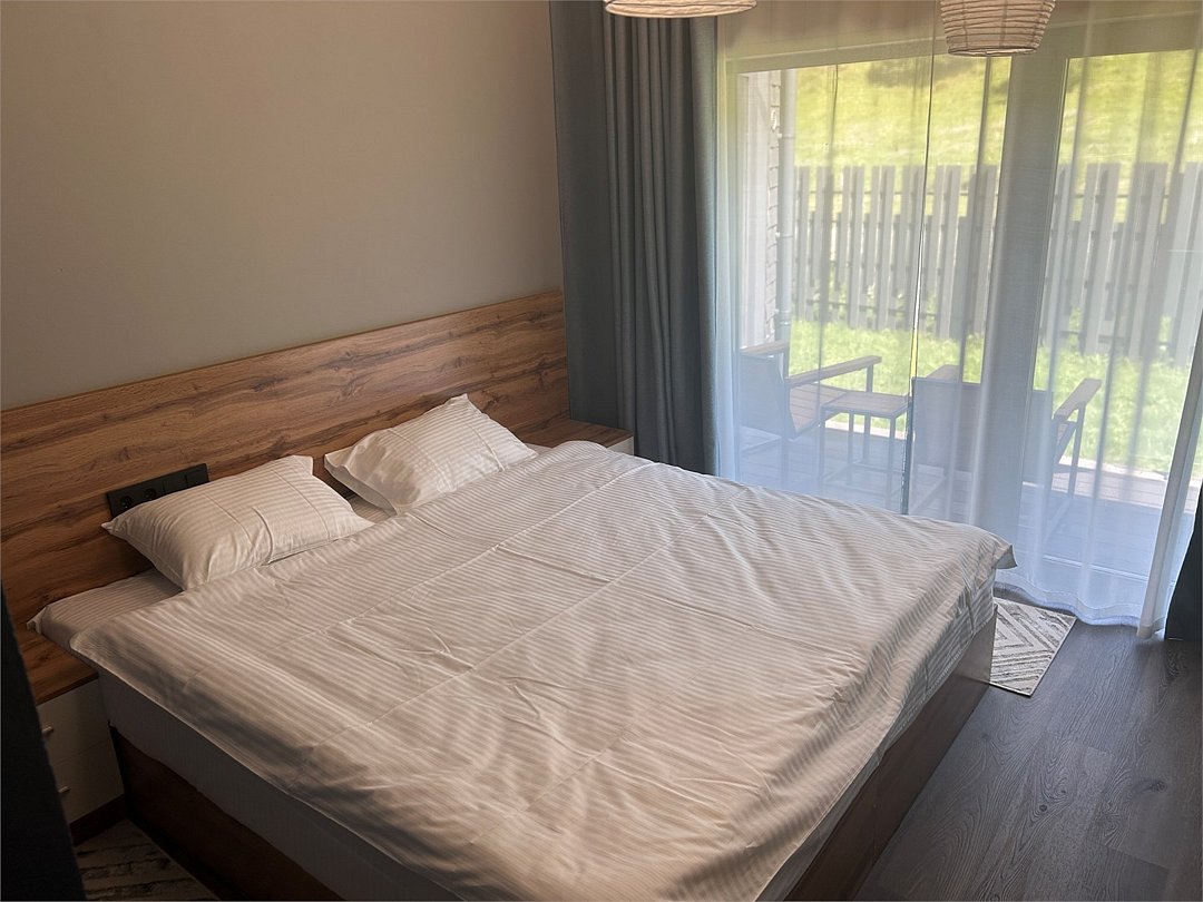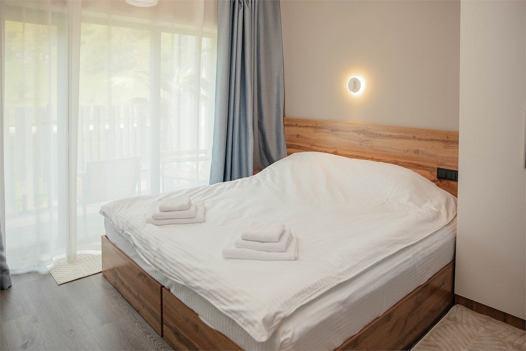 Номер категории «Стандарт» с выходом на террасу. Лаконичный дизайн. Комфорт для двоих. Идеальное сочетание стиля и функциональности для вашего отдыха в сердце Горного Алтая. Организация пространства ✓Площадь: 18 м². ✓Варианты размещения: • 1 двуспальная кровать квин-сайз (180×200 см) или 2 односпальные кровати (по запросу); • детская кроватка, ванночка, горшок, ступеньки предоставляются по запросу гостя. ✓Дизайн: скандинавский стиль. ✓В стоимость номера включены*: • завтрак по комплексному меню (подается в лобби-баре с 08:00 до 11:00 часов); • доступ к бассейну (по графику работы); • охраняемая парковка (1 место на номер). *Отказ от использования услуг не является основанием для пересчета стоимости проживания. Оснащение номера (список ниже) ✓Электроника: • цифровое телевидение (смарт-ТВ); • высокоскоростной вай-фай; • система кондиционирования; • электронный сейф; • фен; • утюг. ✓Удобства: • мини-бар (холодильник с напитками); • чайная станция с набором чая/кофе; • письменный стол для работы; • туалетные принадлежности премиум-класса. ✓Безопасность: • противопожарная сигнализация; • круглосуточное видеонаблюдение на территории; • охраняется Росгвардией. ✓Почему стоит выбрать? • Тишина и уединение… Отель расположен вдали от шумных зон. • Удобное расположение, экологически чистое место – живописное ущелье на берегу горной реки.Услуги и удобства