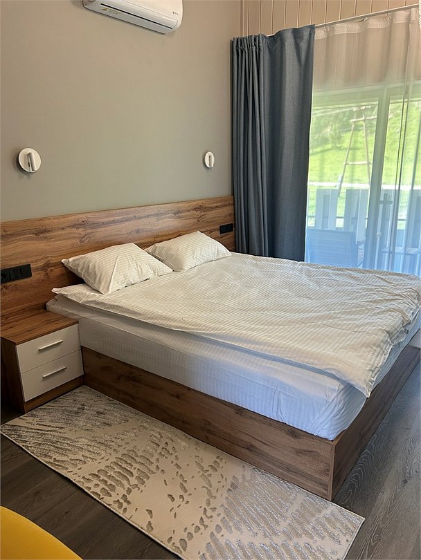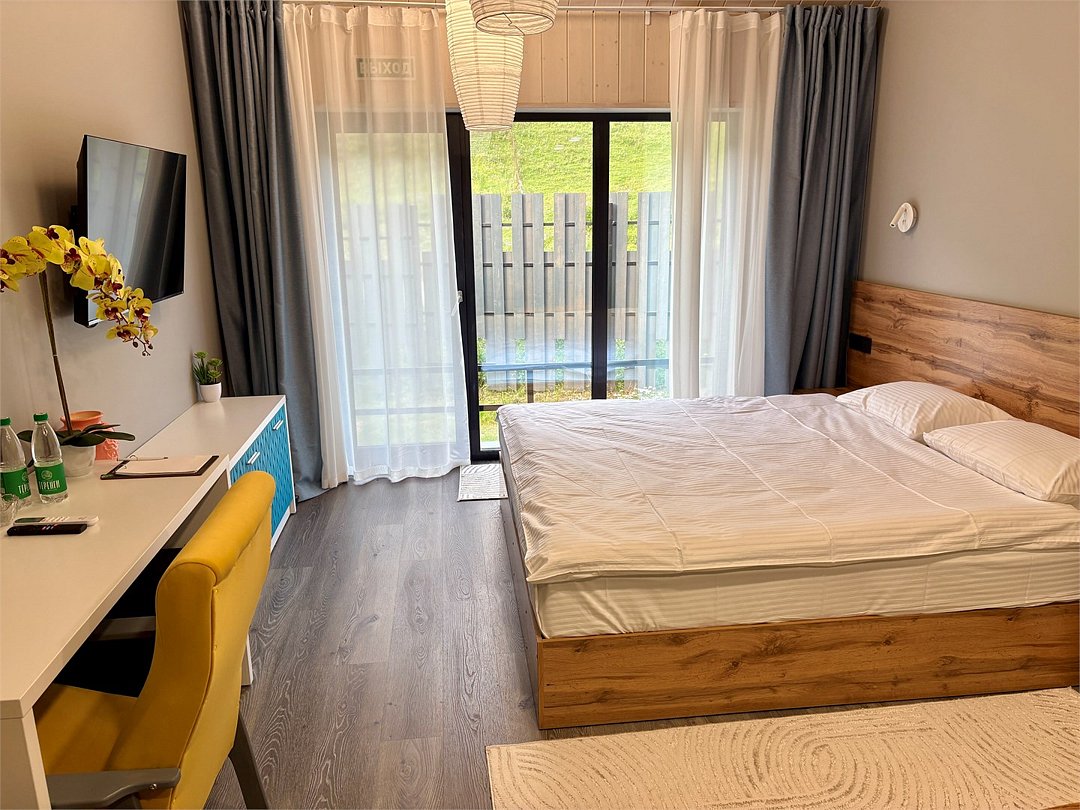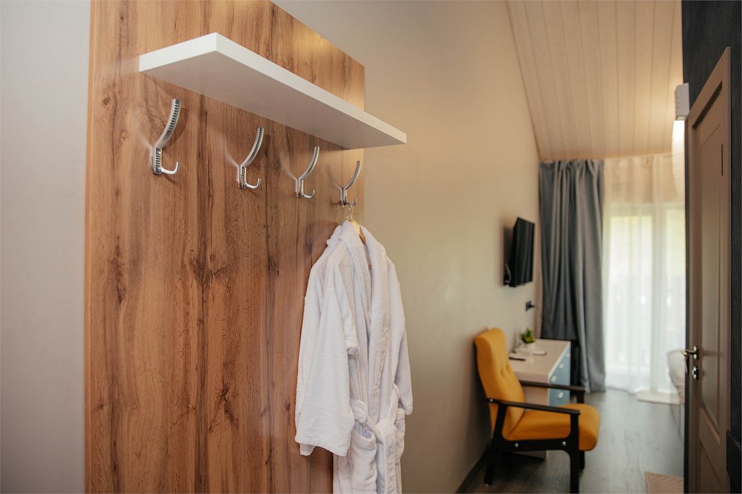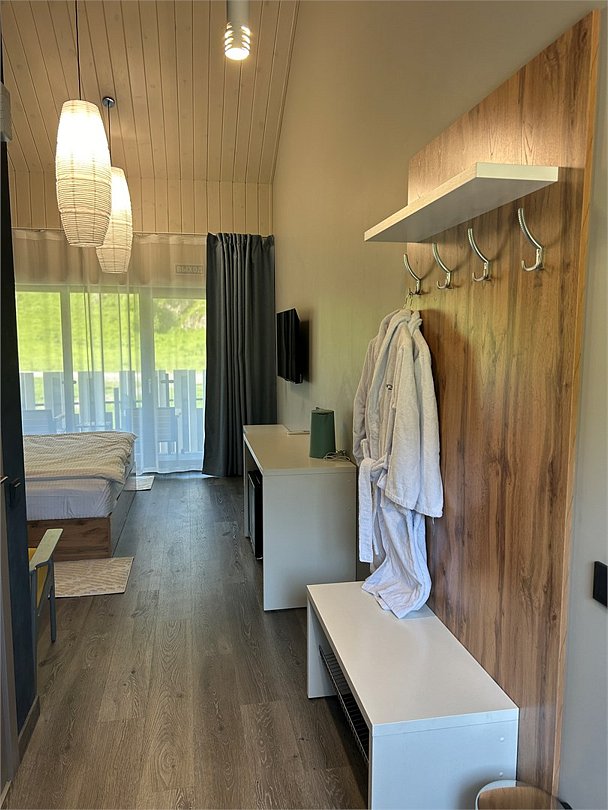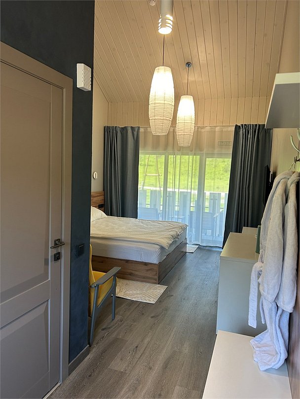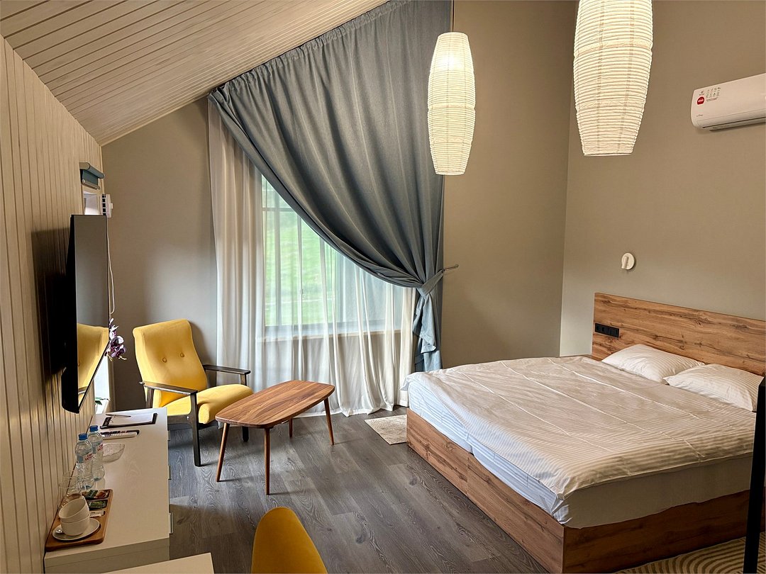 Просторный номер для спокойного отдыха с панорамными видами. Идеальное решение для отдыха двух человек в горах. Организация пространства ✓Площадь: 27 м². ✓Варианты размещения: • 1 двуспальная кровать квин-сайз (180×200 см) или 2 односпальные кровати (по запросу); • детская кроватка, ванночка, горшок, ступеньки предоставляются по запросу гостя. ✓Дизайн: скандинавский стиль. ✓Особенность: панорамные окна с видом на живописные окрестности. ✓В стоимость номера включены*: • завтрак по комплексному меню (подается в лобби-баре с 08:00 до 11:00, можно заказать завтрак в номер); • доступ к бассейну (по графику работы); • охраняемая парковка (1 место на номер). *Отказ от использования услуг не является основанием для пересчета стоимости проживания. Оснащение номера (список ниже): ✓Электроника: • цифровое телевидение (смарт-ТВ); • высокоскоростной вай-фай; • система кондиционирования; • электронный сейф; • фен; • утюг. ✓Удобства: • мини-бар (холодильник с напитками); • чайная станция с набором чая/кофе; • письменный стол для работы; • туалетные принадлежности премиум-класса. ✓Безопасность: • противопожарная сигнализация; • круглосуточное видеонаблюдение на территории; • охраняется Росгвардией. ✓Почему стоит выбрать? • Больше пространства – удобно для отдыха или работы. • Семейный комфорт – идеально для семьи из трех человек. • Вид из окна – наслаждайтесь живописными пейзажами.Услуги и удобства