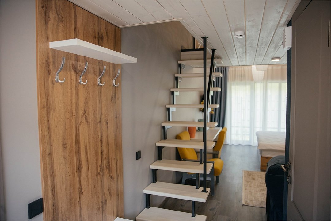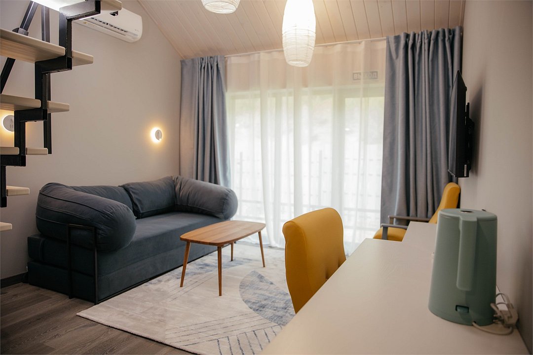 Двухуровневый номер с эффектной планировкой для комфортного семейного отдыха, из окон – панорамный вид. Идеальное решение для отдыха семьи до трех человек в горах. Организация пространства ✓Площадь: 31 м². ✓Варианты размещения: • 1 двуспальная кровать квин-сайз (180×200 см) и диван-кровать или 2 односпальные кровати (по запросу) и диван-кровать; • детская кроватка, ванночка, горшок, ступеньки предоставляются по запросу гостя. ✓Дизайн: скандинавский стиль. ✓Особенность: панорамные окна с видом на живописные окрестности. ✓В стоимость номера включены*: • завтрак по комплексному меню (подается в лобби-баре с 08:00 до 11:00, можно заказать завтрак в номер); • доступ к бассейну (по графику работы); • охраняемая парковка (1 место на номер). *Отказ от использования услуг не является основанием для пересчета стоимости проживания. Оснащение номера (список ниже): ✓Электроника: • цифровое телевидение (смарт-ТВ); • высокоскоростной вай-фай; • система кондиционирования; • электронный сейф; • фен; • утюг. ✓Удобства: • мини-бар (холодильник с напитками); • чайная станция с набором чая/кофе; • письменный стол для работы; • туалетные принадлежности премиум-класса. ✓Безопасность: • противопожарная сигнализация; • круглосуточное видеонаблюдение на территории; • охраняется Росгвардией. ✓Почему стоит выбрать? • Больше пространства – удобно для отдыха или работы. • Можно с животными – мы с радостью примем Вашего питомца в гости. • Вид из окна – наслаждайтесь живописными пейзажами.Услуги и удобства