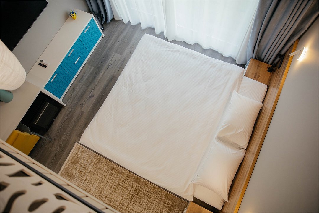 Двухуровневый номер с эффектной планировкой для комфортного семейного отдыха, из окон – панорамный вид. Идеальное решение для отдыха семьи до четырех человек в горах. Организация пространства ✓Площадь: 32 м². ✓Варианты размещения: • 1 двуспальная кровать квин-сайз (180×200 см) и диван-кровать* или 2 односпальные кровати (по запросу) и диван-кровать*; • детская кроватка, ванночка, горшок, ступеньки предоставляются по запросу гостя. ✓Дизайн: скандинавский стиль. ✓Особенность: панорамные окна с видом на живописные окрестности. *Обратите внимание: дополнительное спальное место в вашем номере – это раскладной диван-кровать. В разложенном виде он образует комфортное ортопедическое спальное место на уровне пола. ✓В стоимость номера включены*: • завтрак по комплексному меню (подается в лобби-баре с 08:00 до 11:00, можно заказать завтрак в номер); • доступ к бассейну (по графику работы); • охраняемая парковка (1 место на номер). *Отказ от использования услуг не является основанием для пересчета стоимости проживания. Оснащение номера (список ниже): ✓Электроника: • цифровое телевидение (смарт-ТВ); • высокоскоростной вай-фай; • система кондиционирования; • электронный сейф; • фен; • утюг. ✓Удобства: • мини-бар (холодильник с напитками); • чайная станция с набором чая/кофе; • письменный стол для работы; • туалетные принадлежности премиум-класса. ✓Безопасность: • противопожарная сигнализация; • круглосуточное видеонаблюдение на территории; • охраняется Росгвардией. ✓Почему стоит выбрать? • Больше пространства – удобно для отдыха или работы. • Вид из окна – наслаждайтесь живописными пейзажами.Услуги и удобства