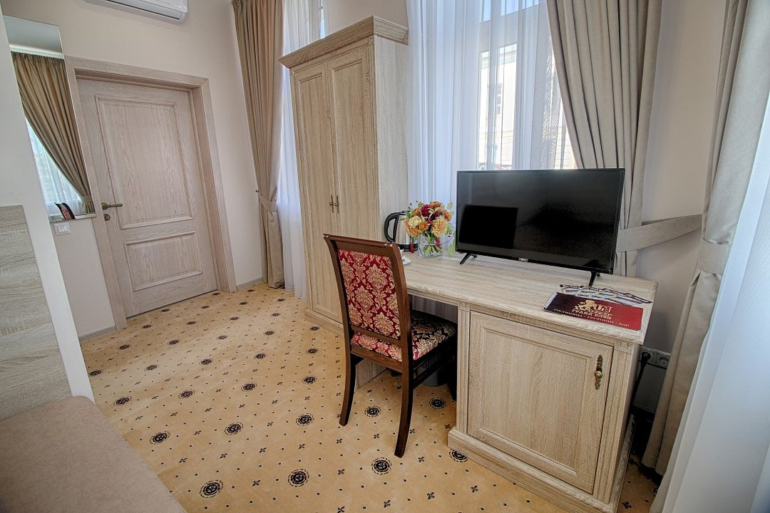 телевизор, телефон, холодильник, кондиционер, фен, ванная комната, халаты, тапочки, кровать «King size», тумбы, шкаф для одежды, письменный стол, туалет, диван-кровать, без питомцевВ номере