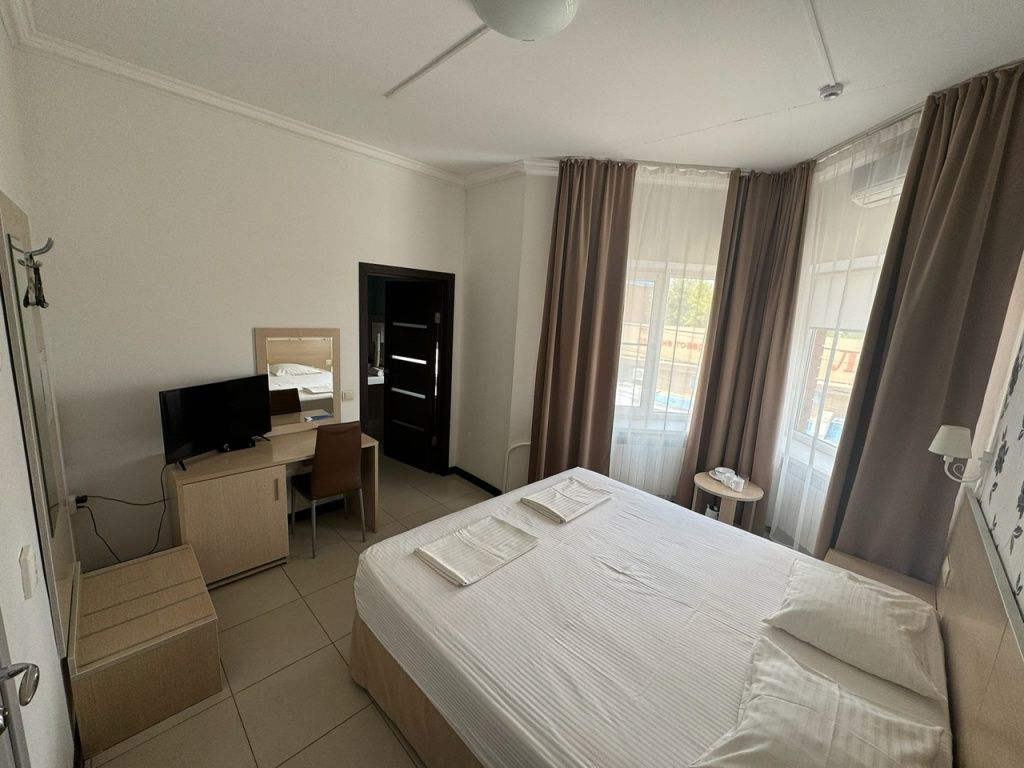 Номер уютно обставлен и оснащён необходимым, чтобы отдохнуть после долгого и насыщенного дня. Имеются телевизор. Оснащение зависит от выбранной категории номера.