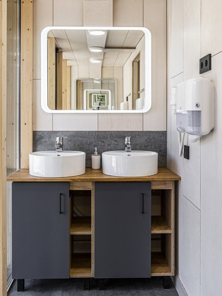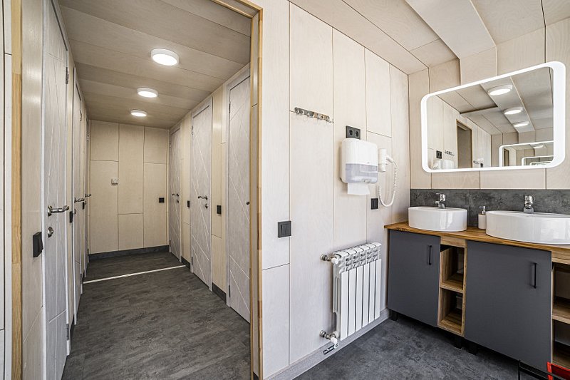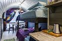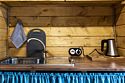 Оснащение: 6 отделенных шторкой спальных мест с розеткой и светильником, личный шкаф с замком, полотенце, общий туалет и душ, фен. Общая зона: столик и стулья.
