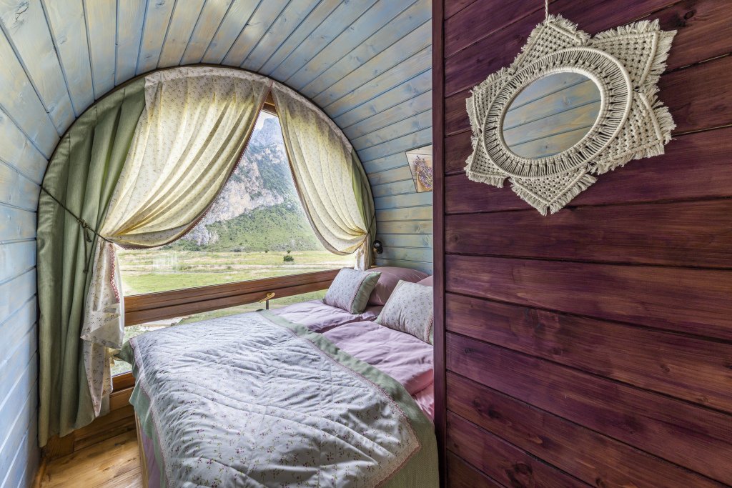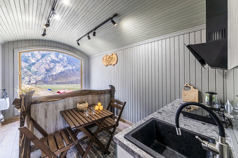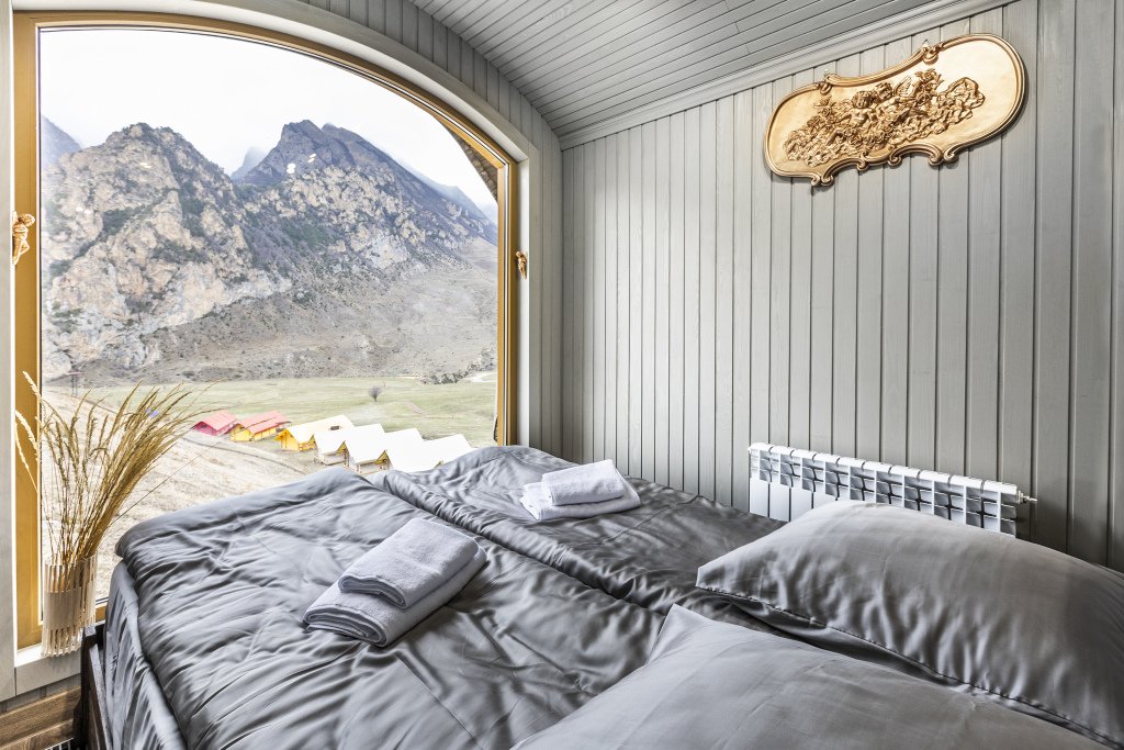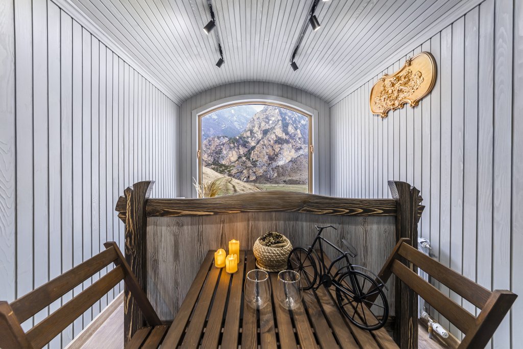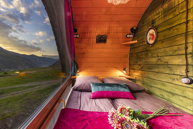 Двухместный дилижанс «Лавандовое Настроение» — это уютное пространство, окутанное нежным ароматом лаванды и обладающее особой атмосферой спокойствия и умиротворения. Панорамное окно открывает взору красоту окружающих гор.