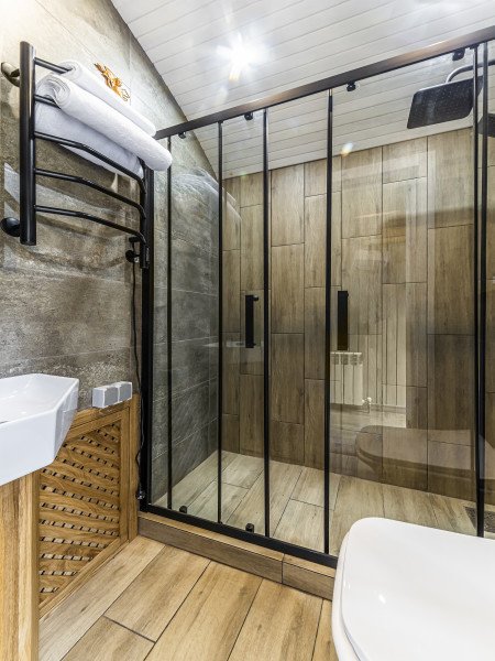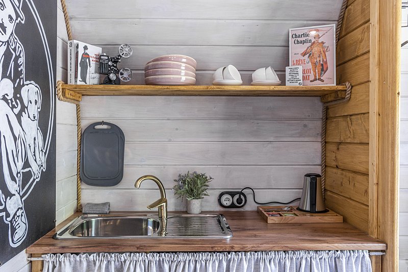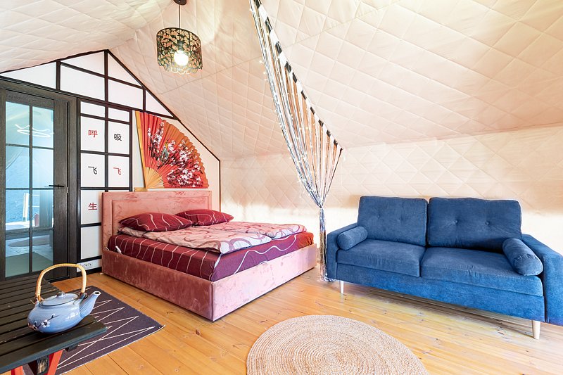 В номере: 2х-спальная кровать, дизайнерская мебель и предметы интерьера, санузел и душ в номере, косметические принадлежности, фен, чайная зона, холодильник, сейф, уличная терраса с мебелью и гамаком, собственная гриль-зона, в холодное время предусмотрено отопление.