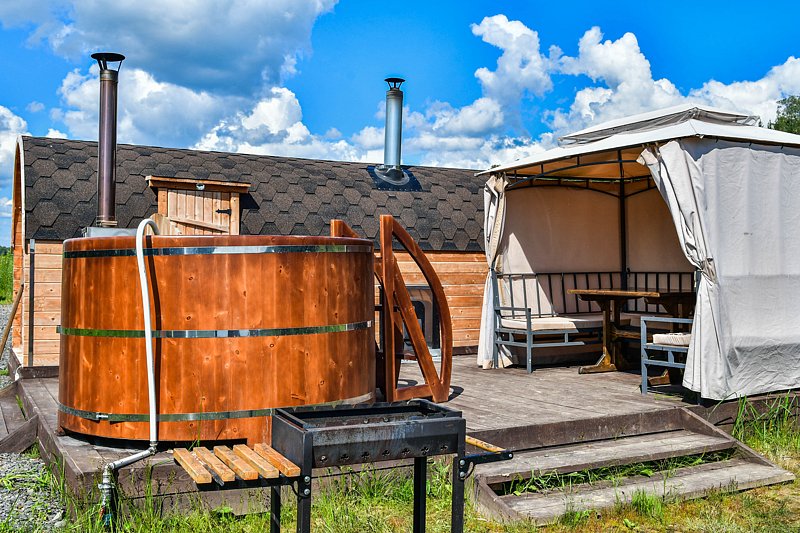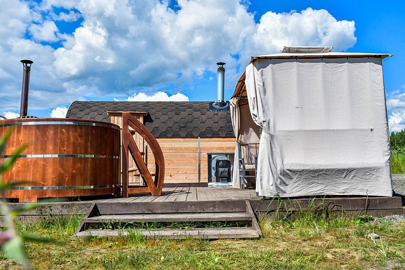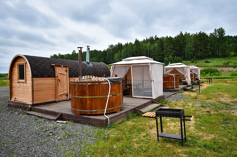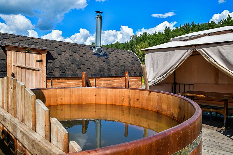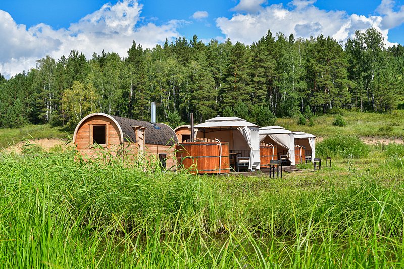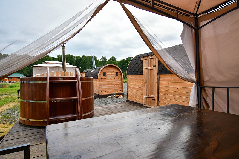 Кедровая на берегу. Компактные кедровые бани на берегу озера. Рядом с баней расположен шатер, оборудованный столами, стульями и мангалом. Вместимость: до 4 человек. Дополнительно доступна к бронированию кедровая купель. Аренда от двух часов.